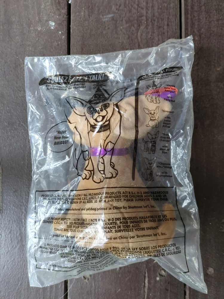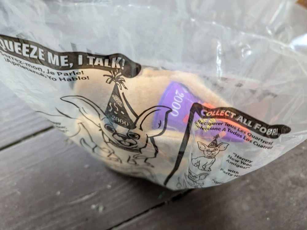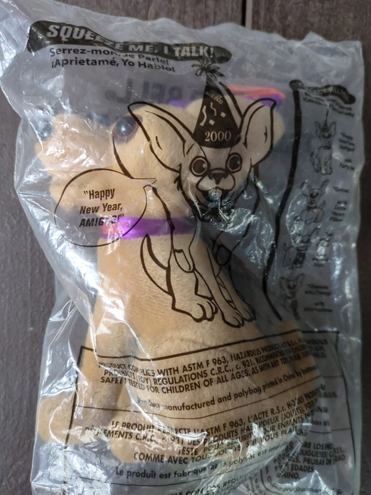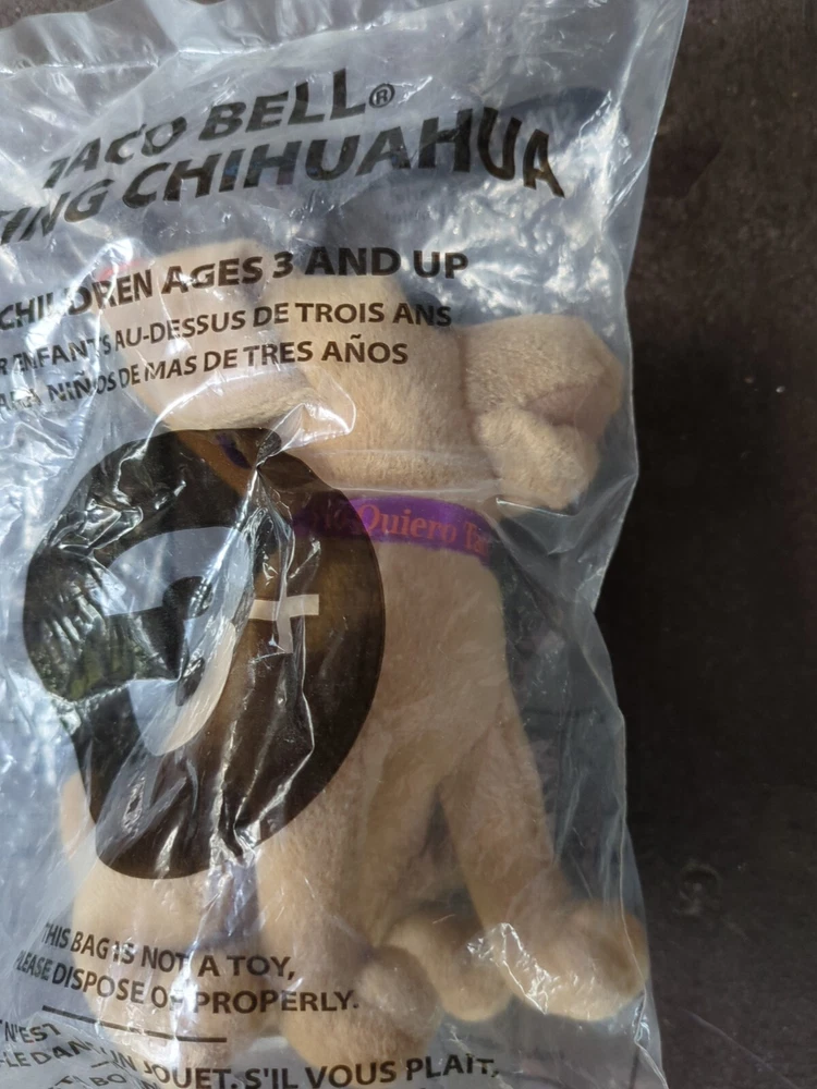 This is a Taco Bell New Years Y2K 2000 Chihuahua plush toy still in its original packaging. The plush toy features the iconic Taco Bell Chihuahua character and is a collectible item related to fast food advertising. The brown plush toy represents the theme of restaurants and fast food, making it a unique and nostalgic piece for fans of Taco Bell memorabilia.