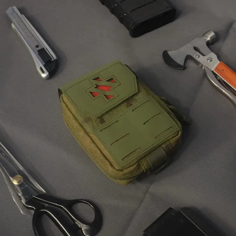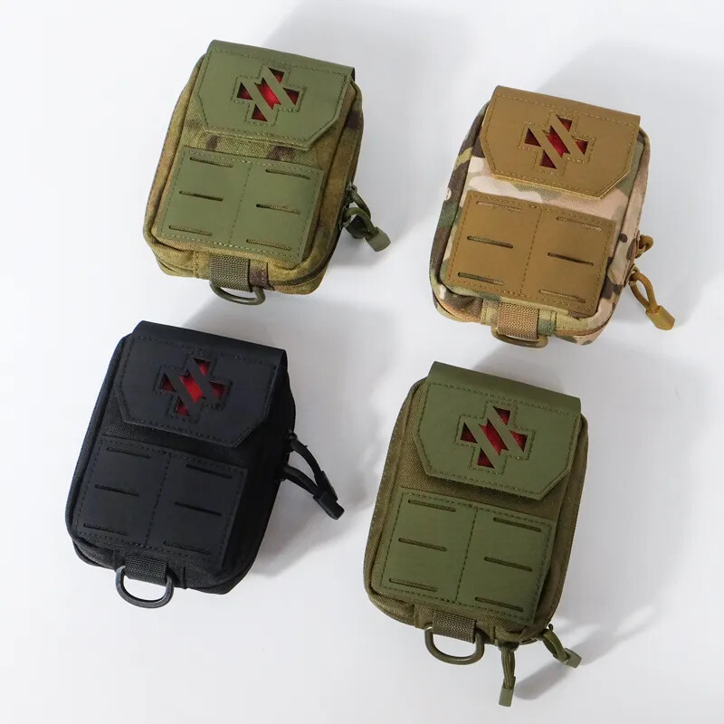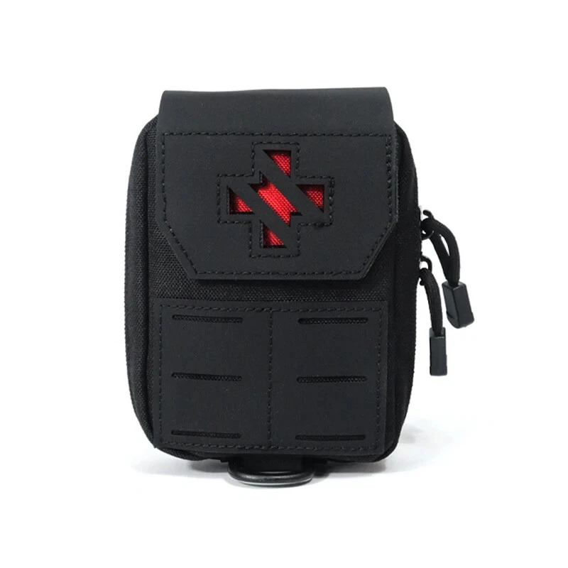 Product Details: Size: 15*13CM Featuire: 2023 Newest design first aid EDC medical pouch Feature 1: laser molle system & 1000D quality material Feature 2: back snap design for waist belt . portable & comvenient