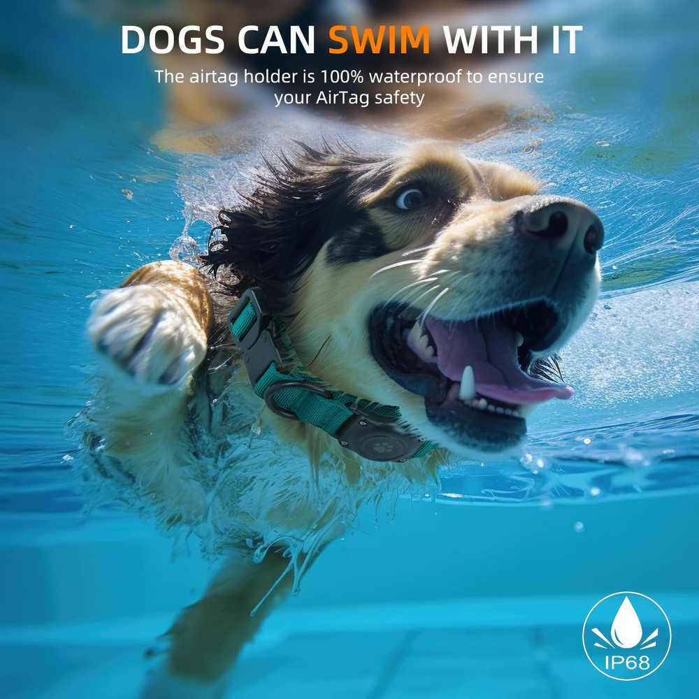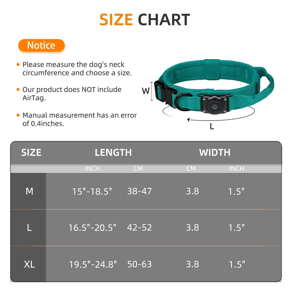 【100% Waterproof】-- This air tag dog collar holder with a fully sealed design and built-in waterproof ring. Dog can swims with it for a long time. It can keep your AirTags dry and avoid AirTag damage due to water Ingress. 【Integrated Design】-- Unlike other separated AirTag case, our Air Tag dog collar has an integrated AirTag holder, which is perfectly compatible with AirTags and effectively prevents the AirTag from falling off or or dangling. (Note: AirTag is not included.) 【Premium Material】-- Tactical airtag dog collar is made of 1000D premium quality nylon fabric and strong metal buckle, very durable and wear-resistant. Soft, breathable and comfortable padded inner won't hurt dog's fur and can protect dog's neck well. 【Double Security】-- Buckle GPS tracker dog collars is designed with Velcro and quick release metal buckle dual design. Adjustable dog collars easy to put on and take off, the metal buckle can be released quickly in case of emergency, guaranteeing safety for your dog. 【Practical Design】-- Military AirTag dog collar comes with an enlarged control handle to help you control your dog well. Available in 3 sizes, fits medium and large dogs. Please follow the size chart to measure your dog's neck carefully before you place the order to ensure the collar is fit well to your dog.