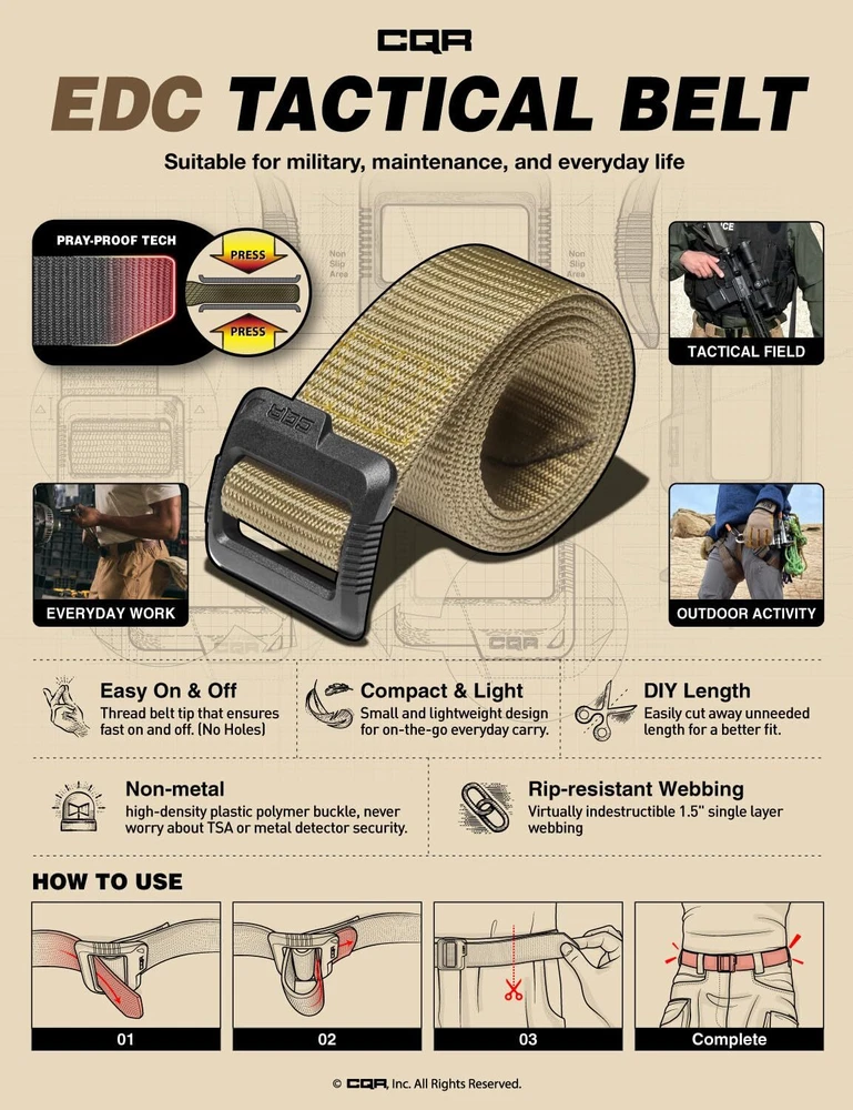 Duty belts are constructed with military standard and law enforcement design Military Specification standard design for durability, ruggedness and reliability. Rip-resistant 1.5" single layer nylon webbing Non-metal sturdy plastic polymer buckle Exceptional versatility crafted with a simple and efficient design Perfect for every occasion yet rugged for many applications An easy thread belt tip ensures fast on and off Tactical Belt Series designed for law enforcement, military, and outdoor activities. [Metarial] The Polyester fabric is rip-resistant and lightweight to allow on-the-go everyday carry. [Plastic Buckle] High-density non-metal buckle does not need to worry about metal detector security. [DIY Length] It is easy to customize the length for making a perfect fit for yourself. It is suitable for tactical training, hunting, camping, maintenance, and everyday life. *Please see below for Size Chart