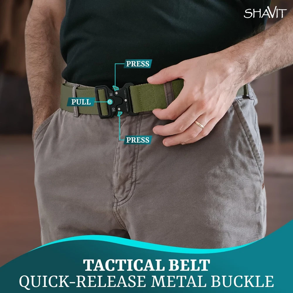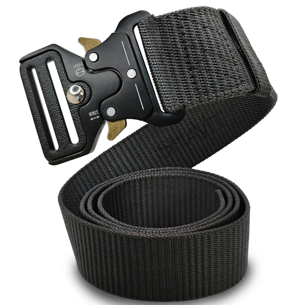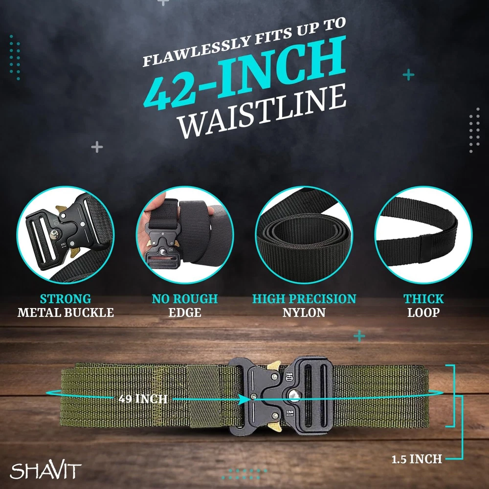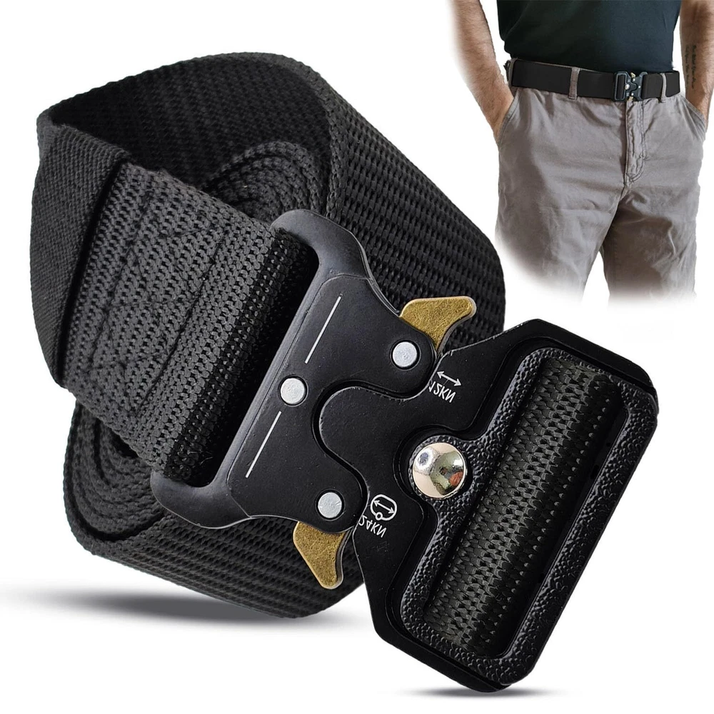 Tactical Military Belt for Men Riggers Work Belt Hiking Web with Heavy Duty Quick Release Metal Buckle Size: Belt Width: 3.8cm / 1.5in Belt Length: 125cm / 49in in this tactical style belt comfortably fits up to a 42” waist Tactical / Work Belt - Stay on Pants - Please Note Buckle wont go trough most loops, see attached picture Easy to Use - Our Tactical Belt Featured with Heavy Duty Quick Release Metal Buckle Best Gift Idea - Belt for Work,Rigger, Hiking, Fishing and more Heavy Duty Military Belt - made of nylon & metal buckle