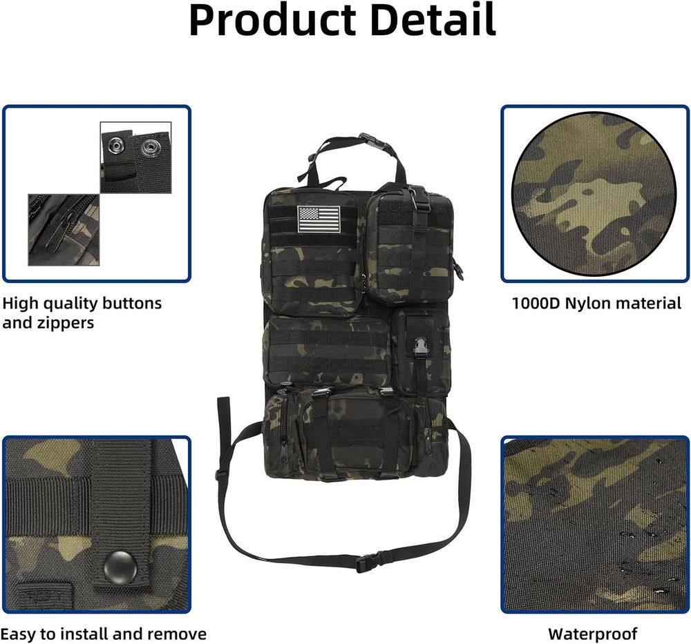 Tactical Car Seat Back Organizer,Tactical Molle Organizer CP Camo Product Details Specific Uses For Product: Automobiles Special Feature: Foldable Color: CP Camo Brand: BIAOXMAW Product Dimensions: 2"D x 14.5"W x 22"H Number of Items: 1 Manufacturer: BIAOXMAW Item Weight: 4.2 pounds Item model number: Seat bag Special Features: Foldable Included Components: bag Batteries Included?: No Batteries Required?: No Specific Uses For Product: Automobiles Special Feature: Foldable Color: CP Camo Brand: BIAOXMAW Product Dimensions: 2"D x 14.5"W x 22"H Number of Items: 1 Manufacturer: BIAOXMAW Mounting TypeNumber of Compartments: Hanging Mount5 【Large Storage】Tactical molle seat back Organizer with 5 different types of molle bags provides ample storage space, can help you solve the storage problem of items of various sizes. Medical pouch holds your first aid supplies. Keeping your car clean and organized 【High Quality Materials】The tactical seat back organizer is made from high-quality nylon with stronger study and breathable,wear-proof and washable,resistant to fading in any environment.Zippers are sturdy,stitching is solid have a great loading capacity.Provide great protection from water, dirt and spills. 【Easy Installation】The car seat back organizer has adjustable strap,makes it easy to install on the top of the car seat headrest and the bottom of the front seats.After installation,the seat organizer can be easily transferred from the set position to the seat position or from the vehicle to other vehicles, which is convenient for your traveling. 【Versatile Compatibility】This truck seat organizer suitable for most vehicles seat back,SUV,truck, pickup,etc.Its universal fit ensures that it can be easily installed in different car models without any hassle. 【Package Including】The molle seat back organizer includes: 1*Tactical Molle Bag,1*Cell phone Pouch,1*Medical Pouch,1*Large Item Storage Pouch,1*Multipurpose Waist Pack,1*Seat Side Bag,1*Carabiner Clip, it provides ample storage space for all your essentials and perfect for your outdoor activities.