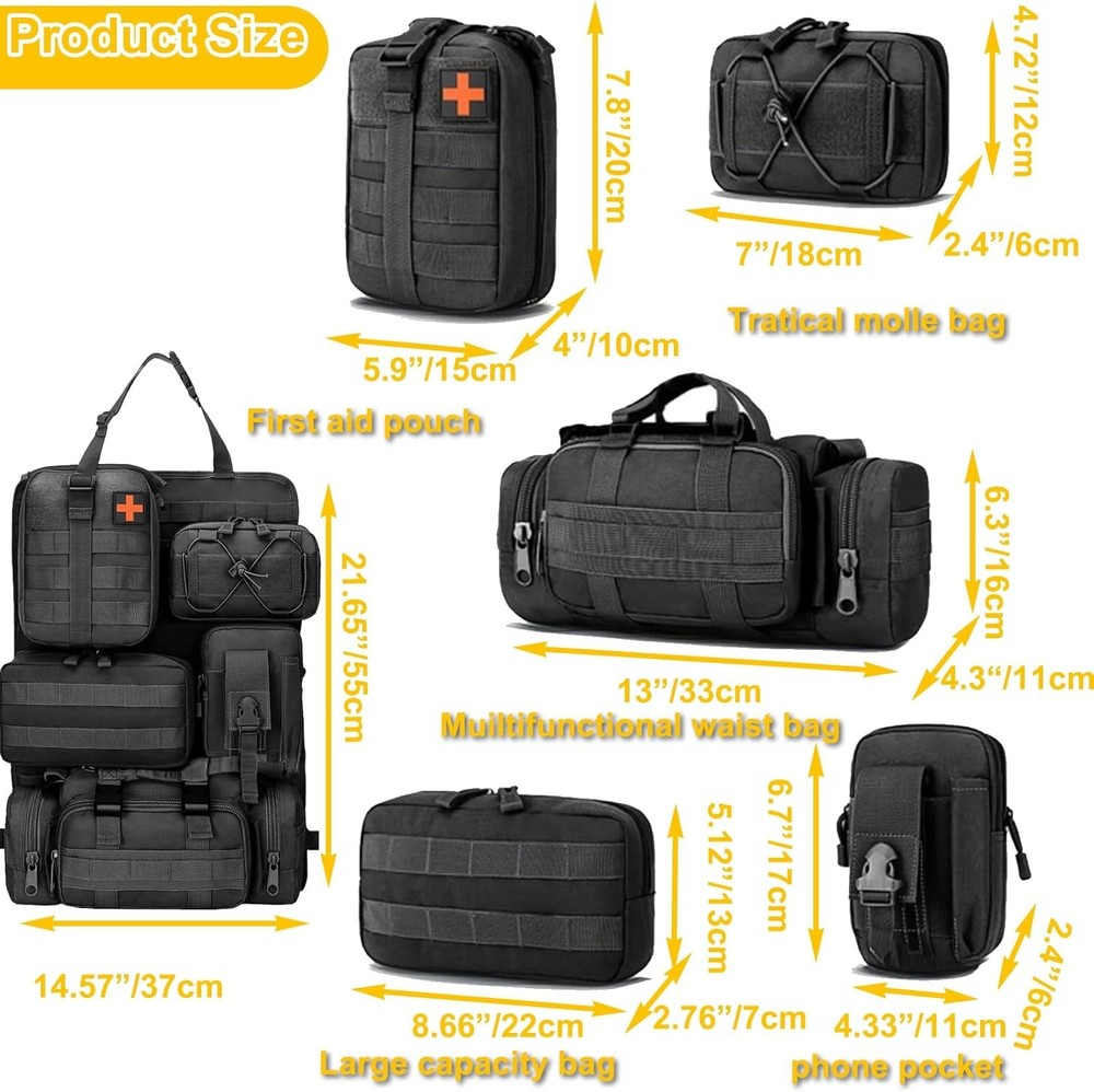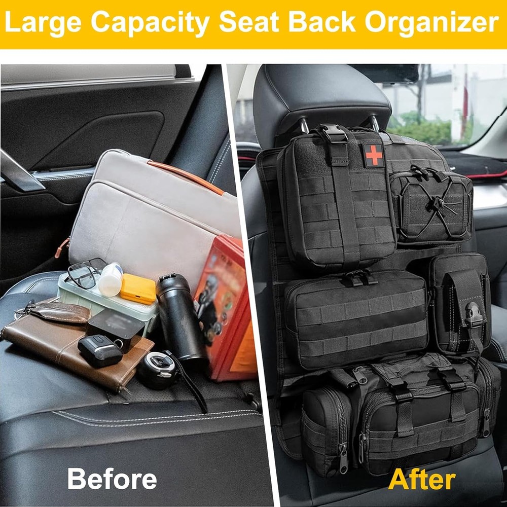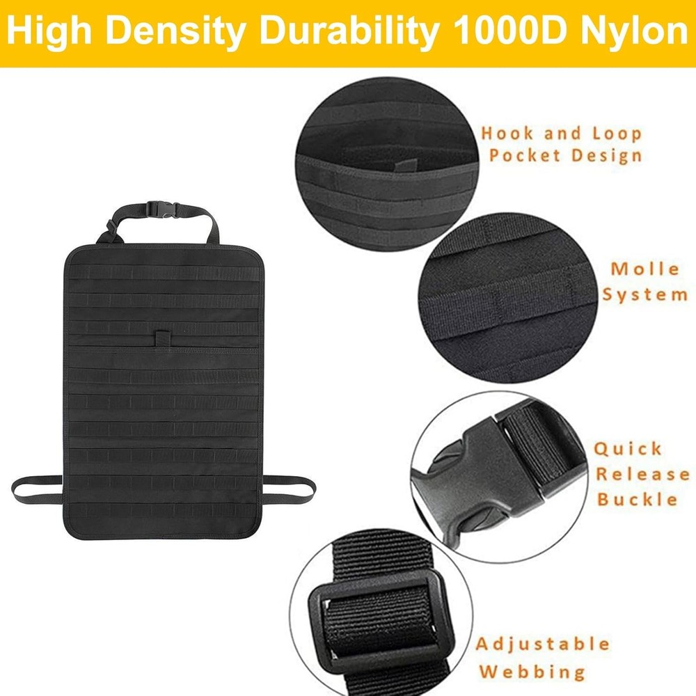 Universal Tactical Car Seat Back Organizer with 5 Detachable Molle Black Product Details Specific Uses For Product: Automobiles Material: Oxford Cloth Special Feature: Detachable Color: Black Brand: Yuehuamech Finish Type: Chrome Product Dimensions: 14.6"D x 14.6"W x 21.7"H Number of Items: 1 Manufacturer: Yuehuamech Item Weight: 3.26 pounds Country of Origin: China Style: fashion Finish: Chrome Item Package Quantity: 1 Special Features: Detachable Included Components: Hanging bag Batteries Included?: No Batteries Required?: No Specific Uses For Product: Automobiles Material: Oxford Cloth Special Feature: Detachable Color: Black Brand: Yuehuamech Finish Type: Chrome Product Dimensions: 14.6"D x 14.6"W x 21.7"H Number of Items: 1 Manufacturer: Yuehuamech Item WeightUnit Count: 1480 Grams1.0 Count Oxford cloth Multi Storage Pockets: This tactical seat back organizer features a versatile design with 5 detachable Molle pouches of varying sizes, allowing you to easily organize and store tactical gear, personal items, and essentials. The tactical pocket, phone pocket, tactical waist bag, large capacity bag and first aid pouch ensure everything has its place, maximizes space efficiency. Perfect for keeping your gear sorted and accessible, whether youre on a road trip, hiking, or in tactical training High Quality Materials: Crafted from premium 600D Oxford cloth, this organizer is built to last. The material is wear- resistant, tear- resistant, and washable, ensuring long- lasting durability. Its water- resistant and breathable properties protect your belongings from dust, and daily wear and tear, making it a reliable choice for any adventure Effortless Installation& Universal Fit: Designed for convenience, this car seat storage comes with an adjustable strap system that securely fits around most car headrests and between the seat back and base. The universal fitment makes it compatible with cars, SUVs, trucks, and more. Simply measure your car seat to ensure a perfect fit, and enjoy a hassle- free setup that adapts to your need Great Storage System: With dimensions of 21. 7 x 14. 6 inches, this seat back organizer offers ample storage space for items of all sizes, from files and tools to cosmetics and first aid supplies. The expandable design ensures you can store everything you need, while the detachable molle bags allow for easy customization. Whether in your car or separated for outdoor activities, this organizer keeps your essentials within Versatile Use for Any Activity : This multi-purpose tactical waist bag is not just for your car—it’s perfect for climbing, hiking, tactical training, daily patrols, and road trips. The detachable molle bag and easy-to-carry design make it a versatile companion for any activity. Stay organized and prepared wherever you go with this all-in-one storage solution Features: Complete Storage System: Our set includes 1 seat back tactical hanger bag panel, 5 detachable storage pouches ( tactical pocket, phone pocket, large capacity bag, first aid pouch, multi- purpose tactical waist bag ). Large Capacity: Our organizer has a large capacity functionality, making it good for storing files, pens, mobile phones, keys, tools, first aid supplies, cosmetics, and more. Premium Quality: Made of quality oxford cloth, our organizer is sturdy. It can withstand daily use and has a great loading capacity. Versatile Use: Our organizer can be installed in the car or separated for various activities. Each pack is equipped with a system on the back that can be connected with other compatible equipment such as tactical vests and backpacks. Great for climbing, hiking, tactical training, daily patrol, road trips, and more. Fits Most Car Models: Our kit is suitable for most car models, including cars, SUVs, trucks, and more. Please measure your car seat to ensure it is suitable before purchasing. Specification: Type: Seat Back Organizer Color: black Material: Oxford cloth Size: L 21. 7'' * W 14. 6'' Package: 1* Panel 5* Storage Pouch Note: Please allow 1- 3cm ( 0. 39- 1. 18'' ) difference due to manual measurement and slight color variation for different screen settings. Package Including Package: 1* Panel 5* Storage Pouch