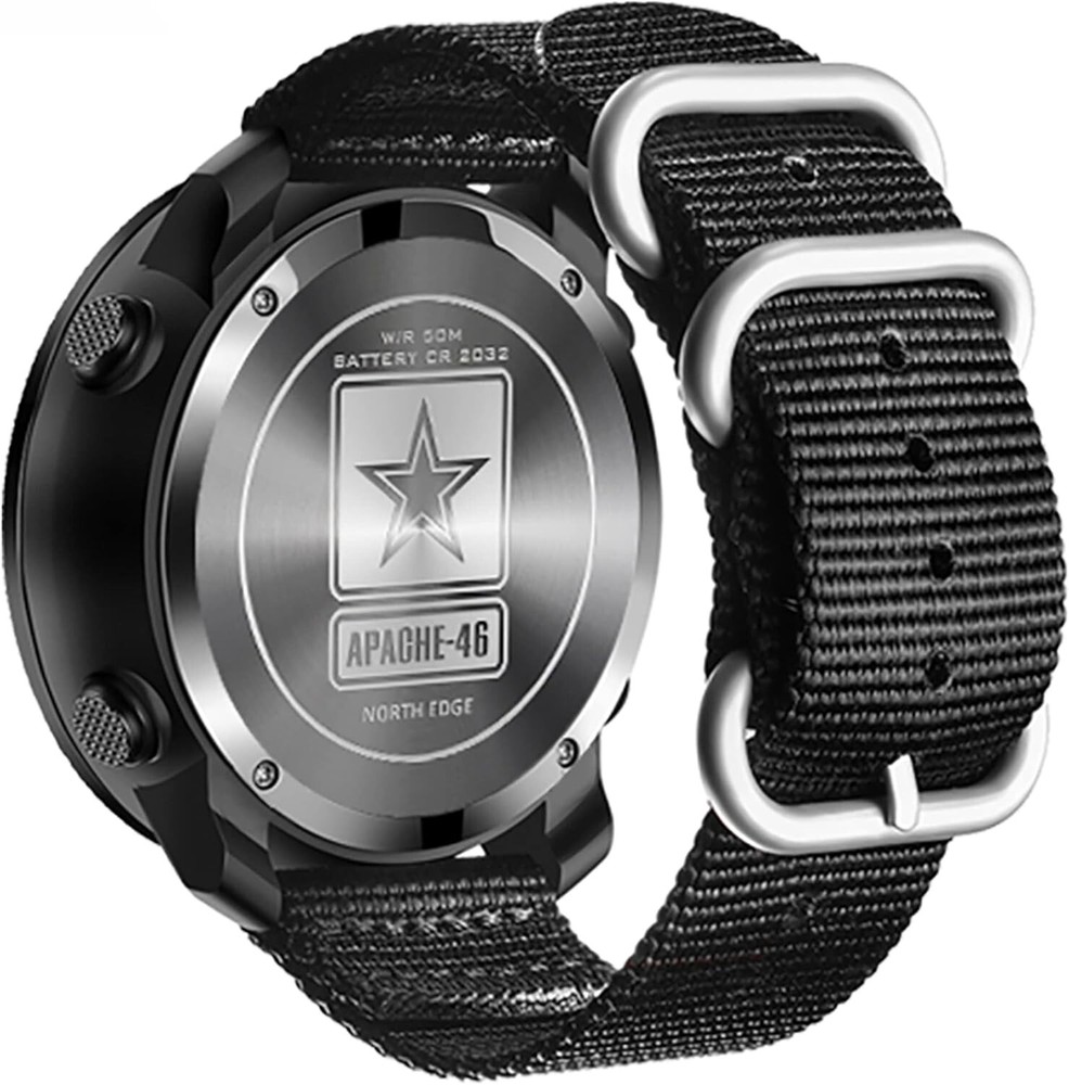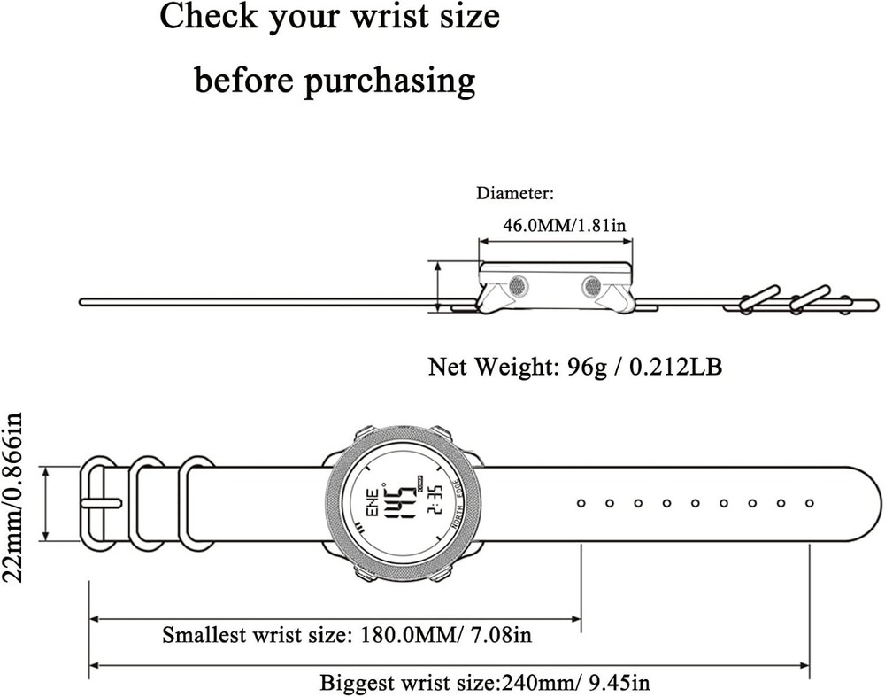 Tactical Military Watch - Digital Outdoor Sports Watch for Men, Pedometer, Compass, Calories, Durable Nylon Band, Model: Dimensions: 46x46x14mm | Weight: 95g ( Display: FSTN | Strap: Durable Nylon | Waterproof: 50M Sensors: Altimeter, Barometer, Compass, Thermometer, Pedometer Compatibility: Weather tracking, swim-proof design, and military-standard durability. Specification Time Functions Hour, Minute, Second, (2000-2099), , Date, Weekday Countdown Timer 99hours59 minutes seconds Alarm Clock 2 Sets Alarm Clock Corporates Digital Compass, Altimeter, Barometer, Thermometer, Air Pressure Trend And Altitude Trend And Altitude Trend El Backlight Air pressure measurement 300~1100mbar/ Height measurement -698~+9164m/-2246~+30067F Temperature measurement 10 ~ + 60 ℃ / 14 ~ 140 ℉ dial material Metal/Glass EL backlight Clear at night Dial thickness