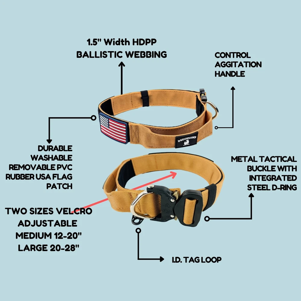 Versatile Sizing: Our tactical dog collar with handle is available in two sizes: adjustable for medium dog collar with neck sizes ranging from 14" to 20" and large dog collar and XL dog collar from 20" to 28". Perfect for accommodating the growth and needs of active dogs. Please measure your dog for a proper fit; measure your previous dog collar or your dog's neck before ordering our wide dog collar personalized dog collar. Professional Grade: 1.5 inch strong dog collar or working dog collar perfect for medium to large breed working dogs; suitable for police dog collar, military dog collar, protection dog collars, or personal pet dogs. Double-layered strong wide thick 1680D ballistic nylon webbing; custom dog collar with fur saver comfortable around your dog's neck yet is durable and reliable big dog collar includes a removable rubber PVC American flag patch Quick Release Metal Buckle: Metal clasp dog collar equipped with a tactical quick-release metal buckle; ensures secure fastening and easy removal of the heavy duty dog collar; ideal for strong, working K9s and active large dogs; perfect for quick release dog collar and dog collar with metal clasp; built-in agitation handle for close quarters control with your tactical collar for dogs Integrated Handle for Control: The heavy duty dog collar features an integrated handle on this dog collar for large dogs , providing extra control over your dog during training or in high-stress situations; ideal collar for dogs collar with handle and customizable dog collar; includes separate ID tag loop for your K9's ID and license tags, preventing accidental removal from the D-ring. USA American Flag Patch: Show your patriotism on your custom dog collar with name dog collar name plate the American flag patch included with our military-style dog collar. This customizable tactical collar allows for additional hook and loop patches or name plates, making it a versatile choice for your pet. Ideal for service dog collar military style and personalized dog collars with name.