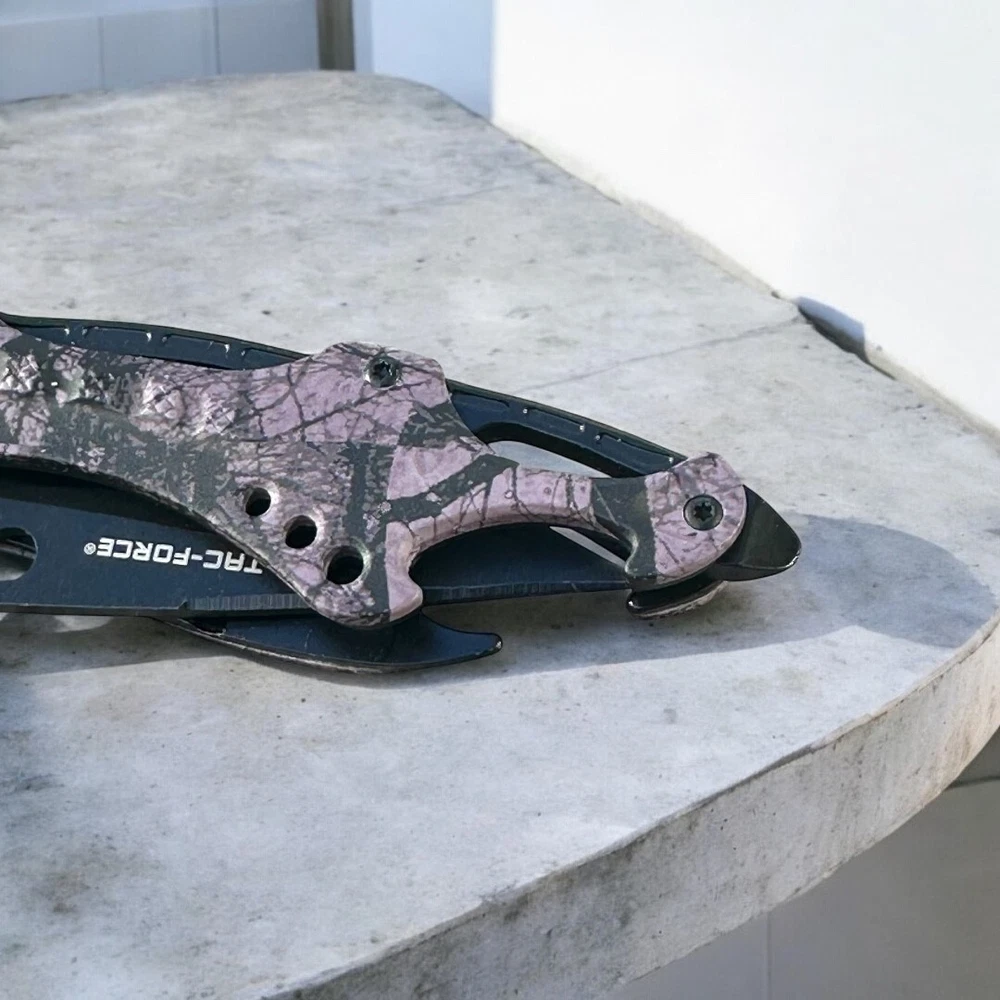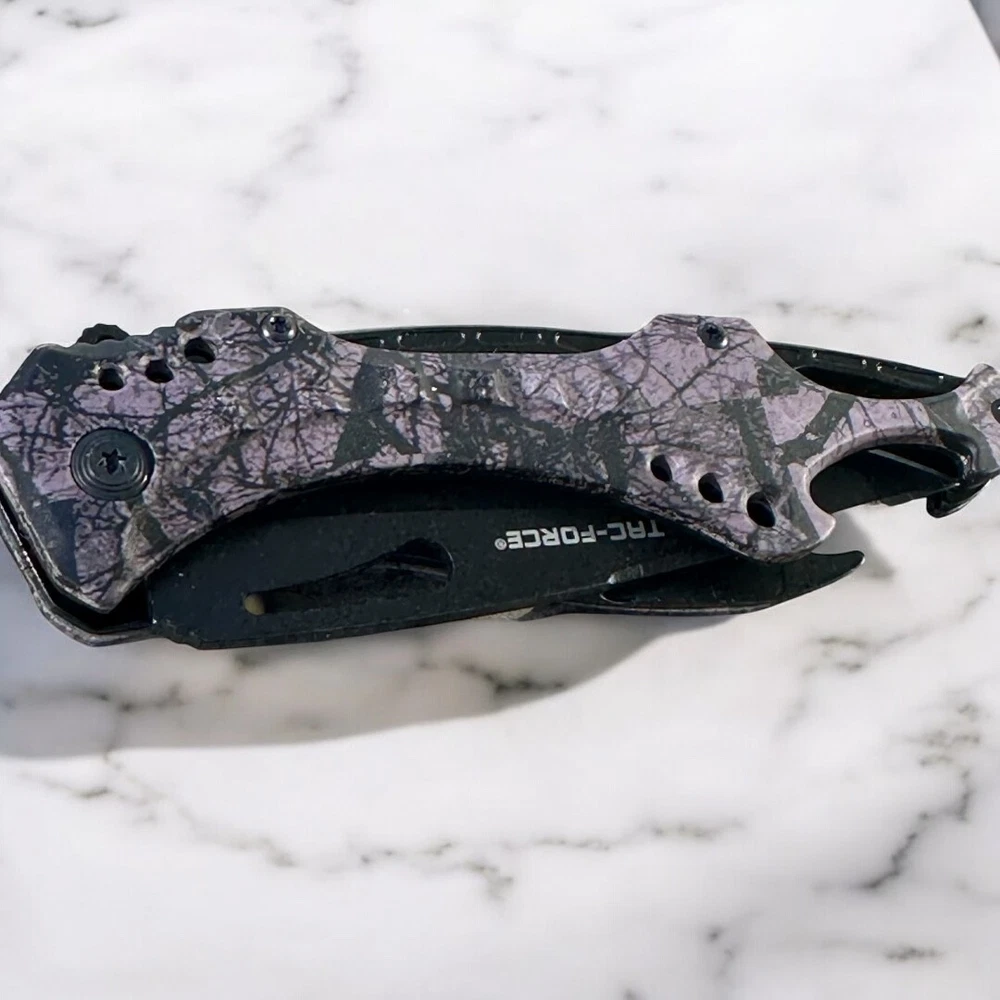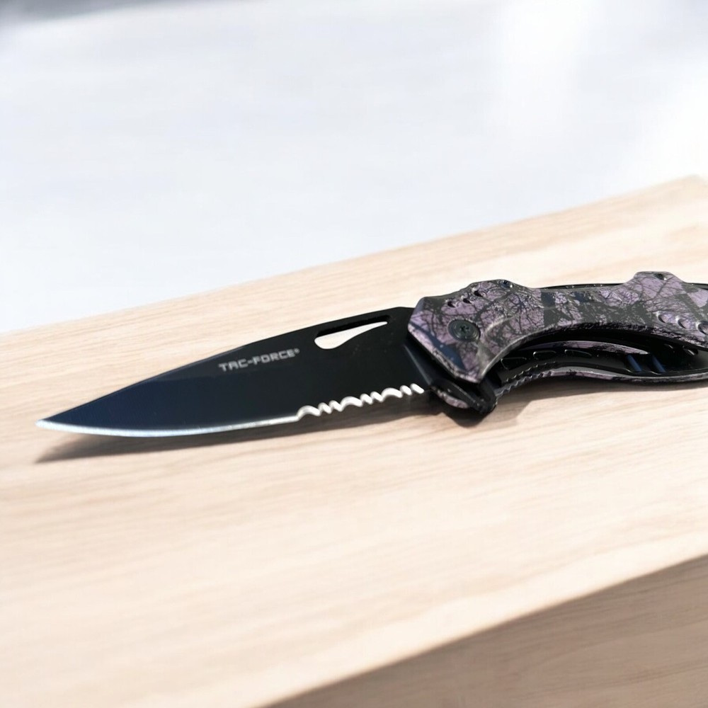 Make a bold statement with this Tac-Force folding knife, featuring a sleek black blade and eye-catching purple camouflage handle. Whether you're collecting, gifting, or carrying for utility, this knife combines function and flair in one durable tool. πΉ Key Features: π§ Stainless steel drop point blade with partial serration π£ Unique purple camo handle with ergonomic grip π© Integrated belt/pocket clip for convenient everyday carry πͺ Built-in glass breaker and seatbelt cutter for emergency use π One-handed thumb stud opening for quick deployment π οΈ Liner lock design for secure blade use Buyer must be 18+ and comply with all local, state, and federal laws.