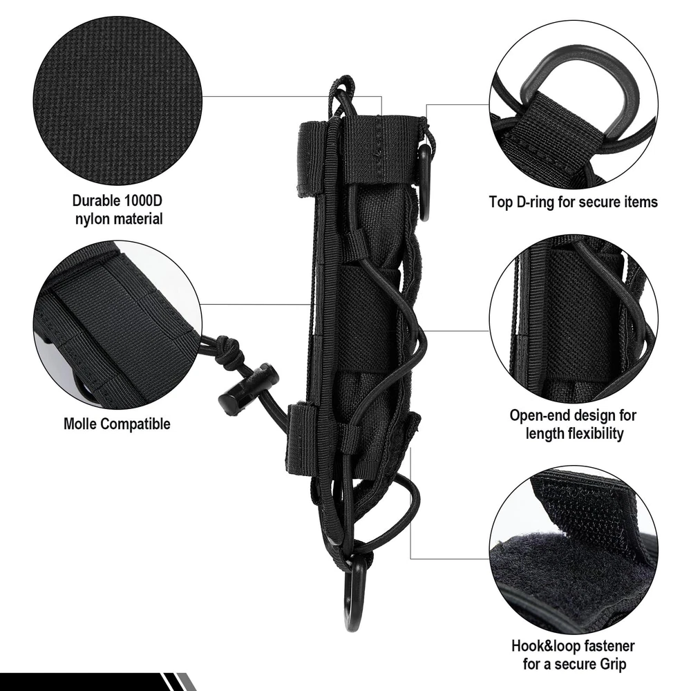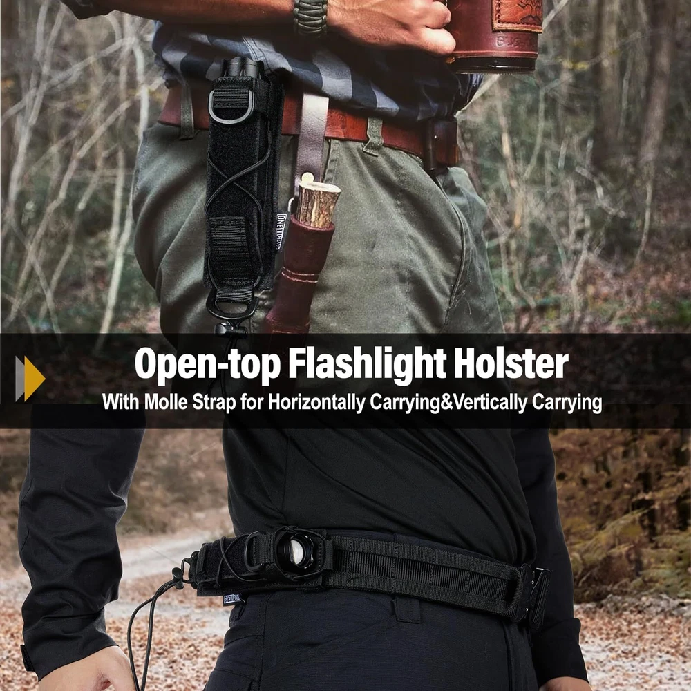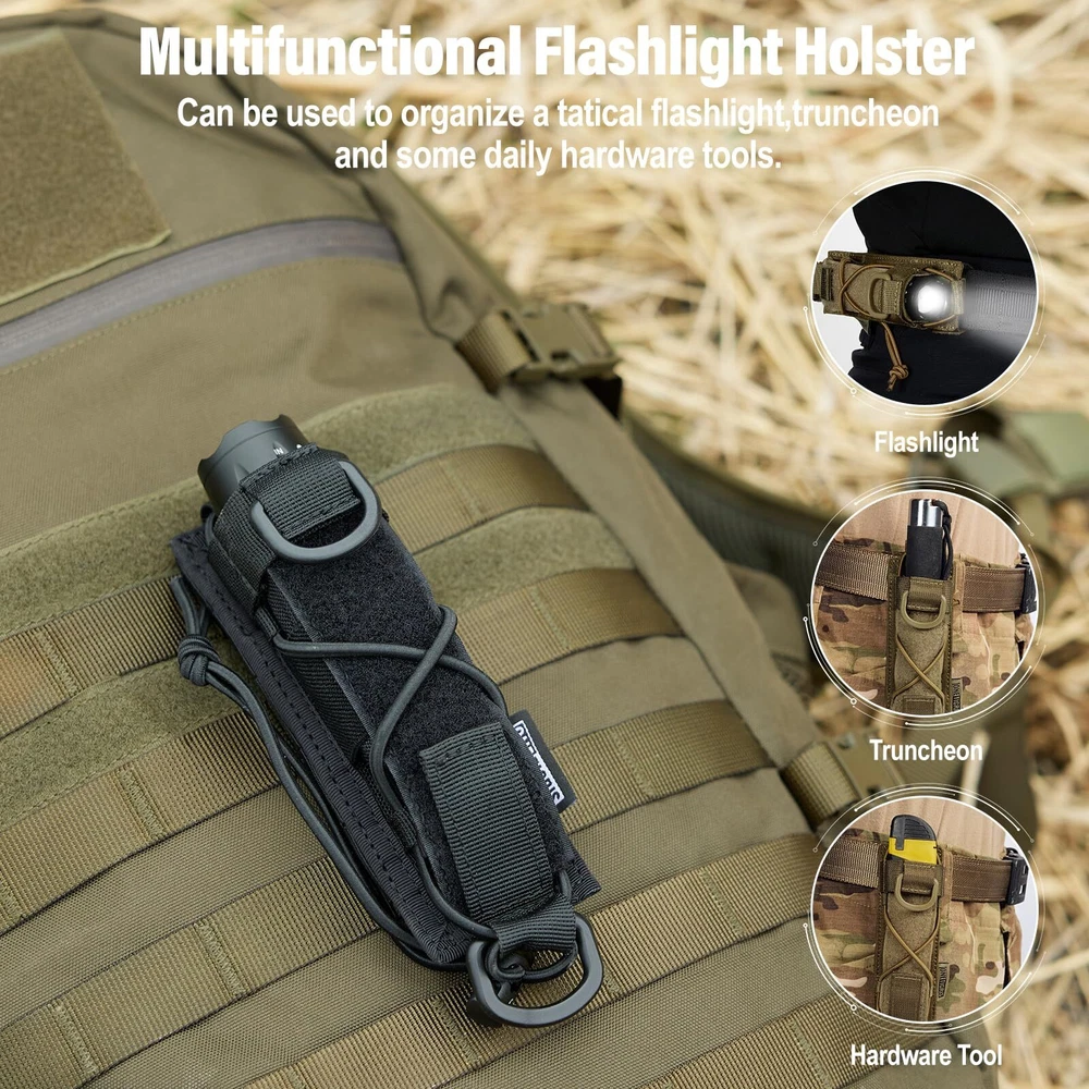WHY CHOOSE LiFE? We will inject tactical elements into everyday life, adding durability, functionality and versatility to things you use day by day. Preparedness is a mindset and gear is an attitude. See life through tactical everyday gear. It only gets better. Why Choose Open-top Flashlight Holster 04? A multifunctional piece of kit with the same minimalist's touch as our HUNTERZ Bottle Holster and MONZTER Utility Pouch, featuring rugged 1000D nylon construction and a highly efficient x-bungee design that keeps your tool in place and at the ready. Its open-end design is ideal for holding linear items from mag pouches to expandable batons, and it can be both vertically and horizontally inserted to the webbing of your gear or waist belt. Specifications Material: 1000D Nylon Dimensions: 6"(L)*2"(W)*1.25"(D)/15.2cm*5cm*3.3cm Weight: 2.9oz/82g Package Includes Open-top Flashlight Holster 04*1 HEAVY DUTY CONSTRUCT: 1000D Nylon construction for extra durability and dirt/water/abrasion resistance; Lightweight, convenient flashlight belt holster for easily access FUNCTIONAL DESIGN WITH STRETCH CAPABILITY: Open end x-bungee design with a hook-and-loop fastened bottom flap; Adjustable for holding items up to 1.5" in diameter VERSATILE TOOL HOLDER: Bungee tied cap at the top for keeping your tool in place; Universal fits linear product like torch. Fits for Fenix TK09 TK15 TK15C PD32 PD35 LD12 LD22 SD10 E20 E25 E35 E35-UE etc., GREAT DETAILS FOR USE: 5" by 1.5" patch panel for your name patch and morale patch; D-ring for securing to your belt, backpack, or for hanging up when not in use MOLLE COMPATIBLE: Vertical and horizontal useful MOLLE straps for fixing onto bags, packs, waist belts, etc. Dimensions: 6"(L)*2"(W)*1.25"(D)