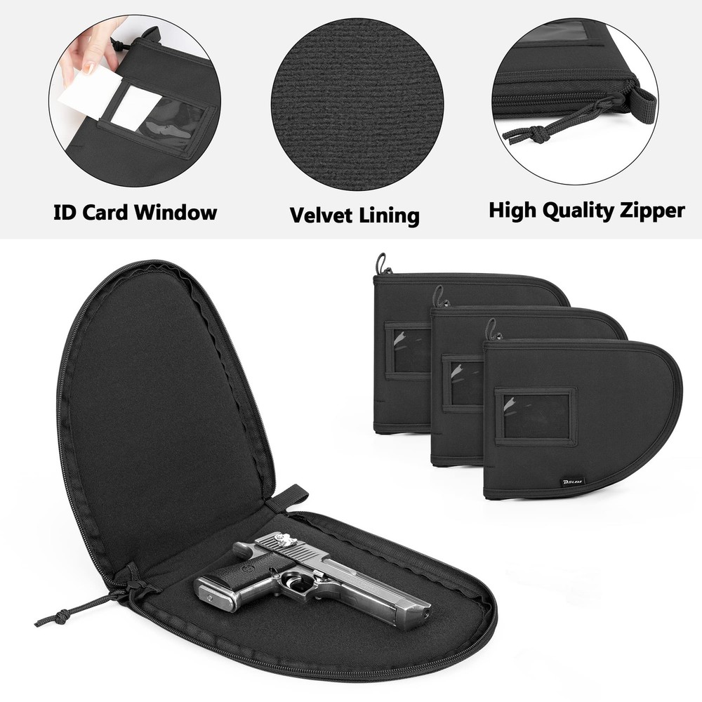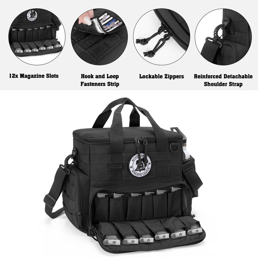 Well Design: The inner removable divider can be adjusted to meet your customized need; the main compartment can hold 3 pistols, earmuffs, glasses, gloves and other necessities; 3 pistol cases can store your pistol separately and the velvet lining secure your gear from wear and damage Large Capacity: The front zippered pocket can carry 12 magazines.; the side zippered pocket and 2 side elastic pockets can carry your phone, wallet, ammo, bottle and so on; the top pocket also provides space to store your shooting accessories Nylon Material: The gun range bag is made of strong and heavy nylon material to secure your gear from the wear; the nylon material and reinforced stitched offer strength, durability and make your range bag last for long time usage Molle System: The front and side molle webbing of range duffle bag expand its storage capacity further and give the bag sleek look; you can attach your molle pouches and equipment to carry more range gear and other essentials User Friendly: The adjustable padded shoulder straps and handle provide comfort shooting and hunting experience; 2-ways lockable zippers, ID card window and flag patch area ( flag patch not include) are ideal for shooting enthusiast; dimension: 11.8 x 8.7 x 10.6 inches