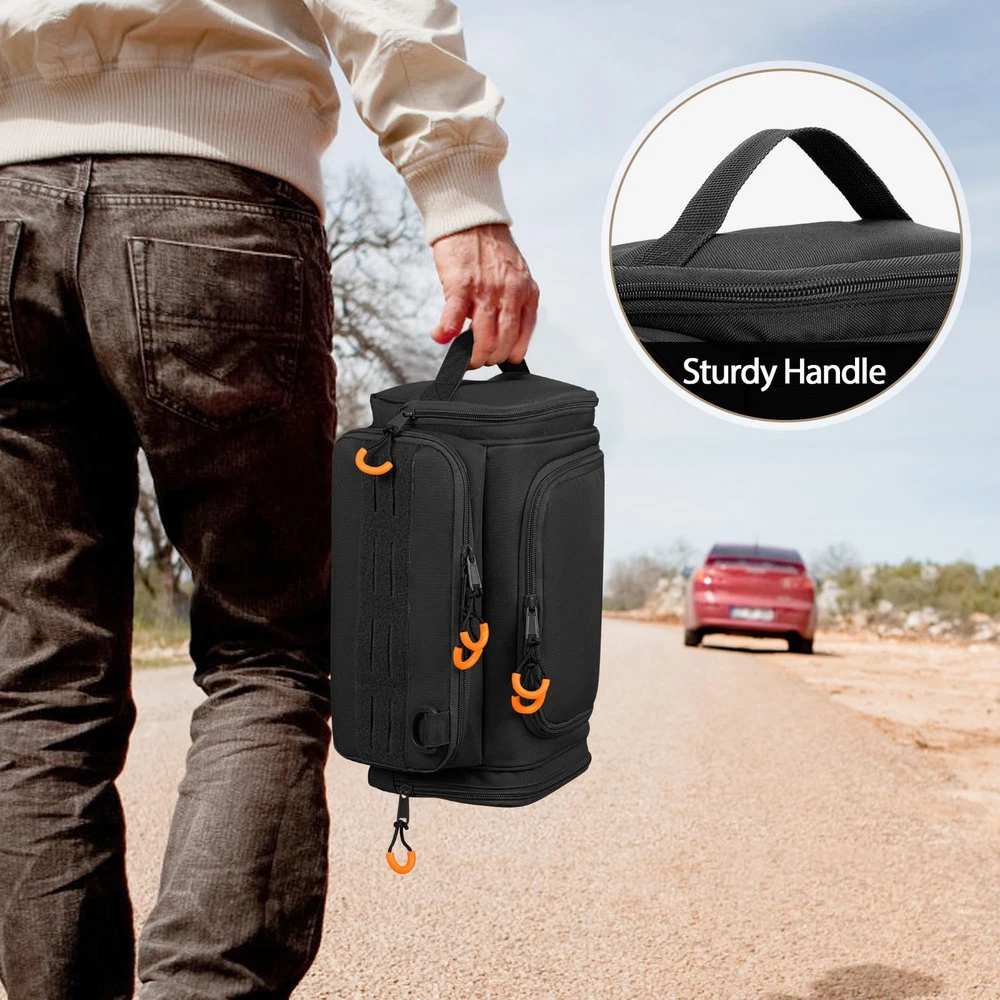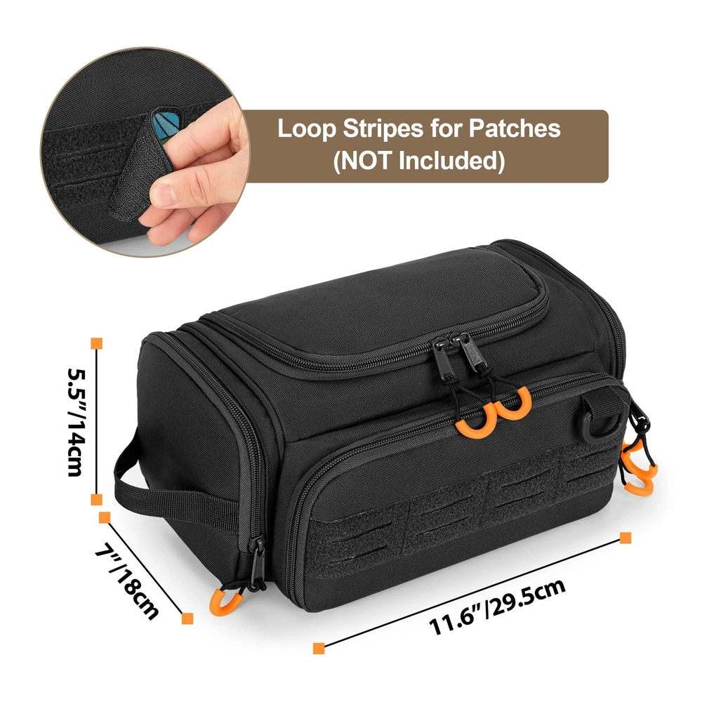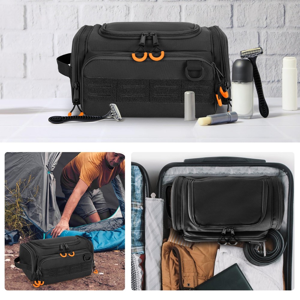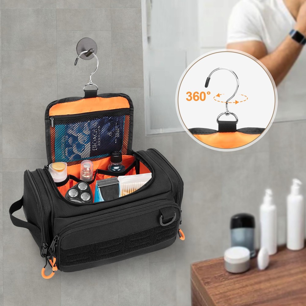 Tactical Toiletry Bag for Men, Hanging Hygiene Bag, Travel Dopp Kit Organizer for Shaving, Shower Essentials and Toiletries, Black (Empty Bag) LARGE CAPACITY TOILETRY BAG: The spacious main compartment can easily fit essential toiletries like shampoo, shower gel, shaving cream, and skincare products. Travel toiletry bag features 3 elastic pouches to hold perfume, swabs, and travel-sized toiletries. (Empty bag only, NOT includes any accessories.) DRY & WET SEPARATION: The front compartment made with water-resistant lining for easy wiping. It features 2 mesh pockets for wet towels or toiletries, and 3 elastic bands to hold toothbrushes and toothpaste. TOILETRY BAG WITH HOOK: The top flap features a mesh pocket for storing personal items and a 360-degree swivel, non-slip hook that easily hangs on towel racks, coat hooks, or tree branches. This design saves space and provides easy access to toiletries while bathing. PRACTICAL DESIGN: Two side zip pockets with mesh pouches store clean towels or socks, keeping them accessible. This hygiene bag features a side carry handle for easy transport. Front loop design allows for personalization with patches and badges. VERSATILE USE: Dimensions: 11.6 x 7 x 5.5 inches. The toiletry bag is made from polyester fabric to protect your toiletries during outdoor use. Sturdy construction, excellent workmanship, double zippers and easy-to-grip zipper pulls make it ideal for business trips, travel, camping, fitness and organizing tools and medicines.