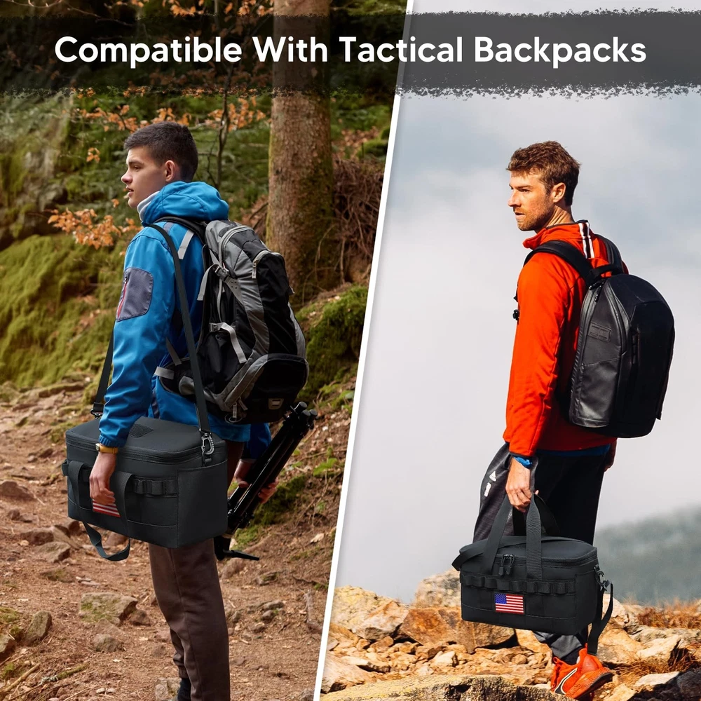 Specification:Origin: Mainland ChinaMaterial: 600D Oxford Cloth, Pearl Cotton, Aluminum FilmSize: 35cm/13.77in * 20cm/7.87in * 17cm/6.69inUse: Camping Bag, Picnic Bag, Insulation Bag, Cooler BagNote:Due to the different monitor and light effect, the actual color of the item might be slightly different from the color showed on the pictures. Thank you!Please allow 1-2cm measuring deviation due to manual measurement. 【LARGE CAPACITY & ORGANIZED STORAGE】This tactical lunch bag holds up to 14L (fits 18 cola cans) and measures 13.8" x 7.9" x 6.7". It features 2 front zippered pockets, 1 side mesh pocket for bottles, and 1 zippered MOLLE pocket. The front patch area lets you add your favorite patches. With 5 compartments, it’s perfect for work lunches, camping snacks, or outdoor adventures. 【KEEP IT COOL OR WARM ALL DAY】With 3 layers of 8mm PE foam insulation, this bag keeps your food and drinks cool or warm for up to 8 hours. The waterproof, oil-proof lining makes cleanup a breeze—just wipe and go. Fresh meals, no hassle. 【MOLLE SYSTEM FOR THE WIN】Equipped with MOLLE webbing on the sides and back, you can attach pouches, keys, or tools. Clip it to your tactical backpack or customize it your way—it’s built for more than just lunch. 【BUILT TOUGH WITH 900D FABRIC】Made from rugged 900D Oxford fabric, this bag resists water, dirt, and wear. Smooth zippers and reinforced stitching mean it’ll handle your toughest days without tearing—it’s as tough as your to-do list. 【MULTIPLE WAYS TO CARRY】Comes with a 66-inch adjustable shoulder strap and grab handle for easy carry. Whether it’s work, camping, or a picnic, this bag is ready for the ride. Pro tip: It holds more than just sandwiches.