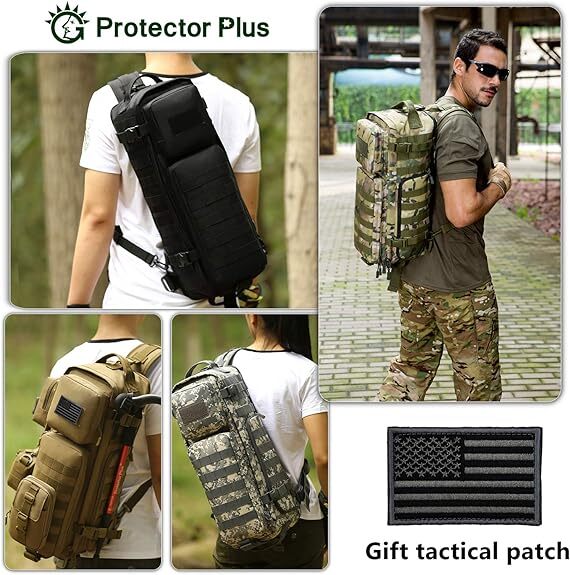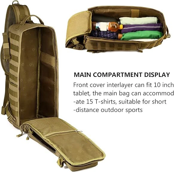 out this item ✅ MATERIAL -- Made A+ Grade durable nylon ripstop fabric; scratch-resistant, water-repellent, not easy to fade after long-term use, which wear-resistance is higher 10 times than conventional polyester fabric tension ✅ OUTSTANDING STRUCTURE -- 20" W x 8.2" H x 7.4" D. The tactical sling pack designed has multiple pockets for storing different stuffs. The 2 front for frequently-used items, and right side zip pocket and left side open pouch can fits things easy take them in and out; The large compartment can fits up to 20 shirts; The hidden back zip pocket for valuable items; Multi-layer storage compartments can accommodate a lot of EDC equipments ✅ MOLLE MODULAR DESIGN -- Molle webbing system on front and both sides, designed to be used in combination with other equipments, you can attaching extra pouches or gears; such as kettle pouch, walkie-talkie pouch, first-aid pouch, torch pouch and so on ✅ INTIMATE DESIGN -- Backpack has hydration system that works great for a up to 3L hydration bladder (Not included) as hydration pack; Hook-and-loop for attaching personality tags according to your own liking; The pack can be carried on both shoulders; This tactical sling bag double stitched, padded shoulder straps and back area with mesh backing for comfort, ventilation, and strength during travel. With high-quality zipper. Easy adjustable waist & chest straps ✅ WIDE APPLICATION -- 3 Carrying options (shoulder bag, chest / back sling bag, hand carry bag). Well-organized items placement serve you in different usage scenarios from everyday use, stroll, camping, hiking, to trip and travel