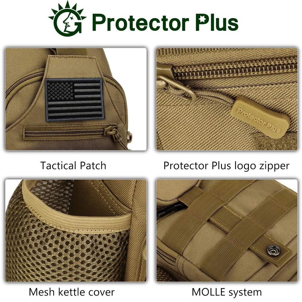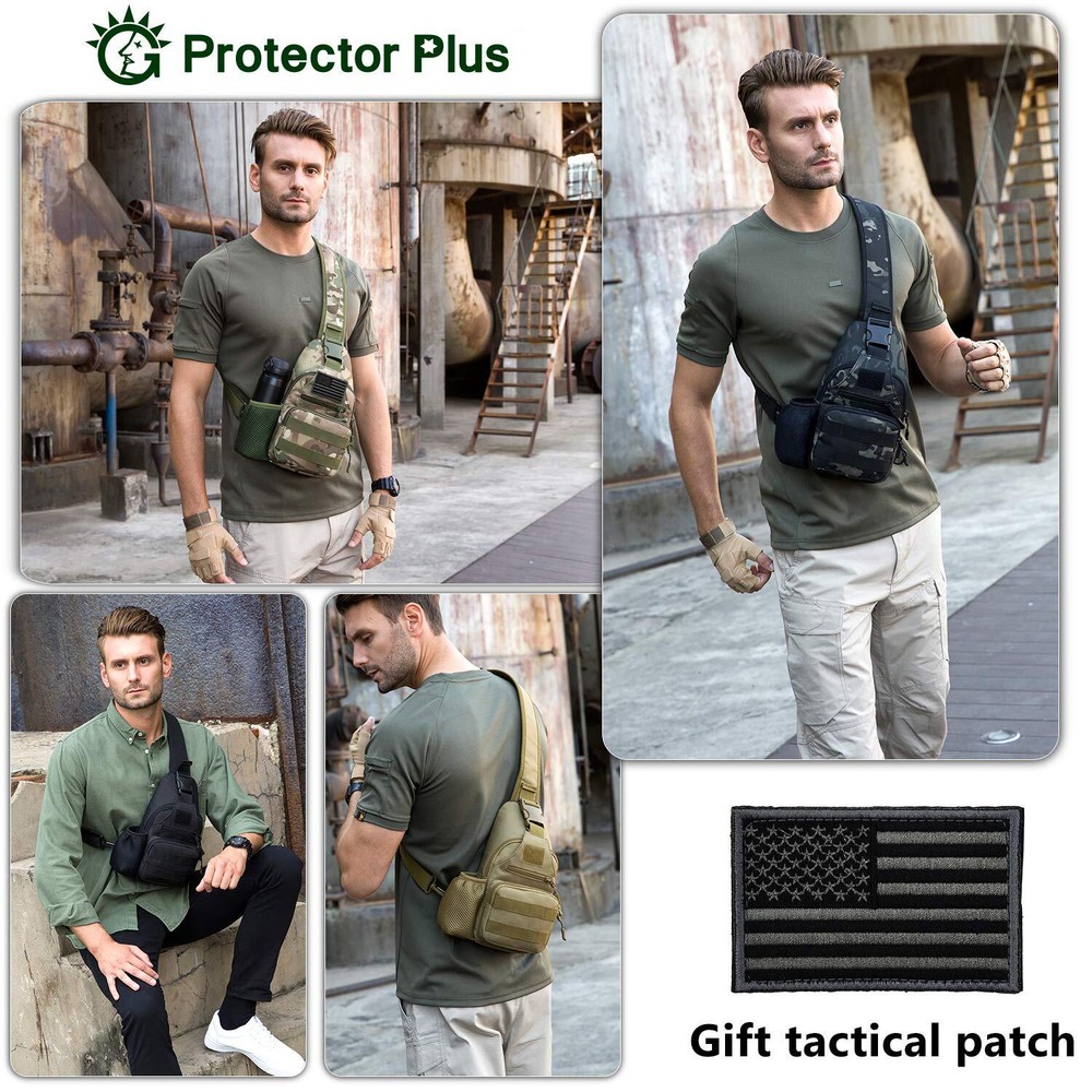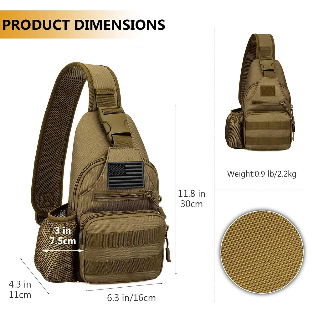✅ MATERIAL -- Made A+ Grade durable nylon ripstop fabric; scratch-resistant, water-repellent, not easy to fade after long-term use, which wear-resistance is higher 10 times than conventional polyester fabric tension ✅ OUTSTANDING STRUCTURE -- 6.3" W x 11.8" H x 1.96" D. The tactical sling pack has multiple pockets, includes 1 zipper main compartment, 1 front zipper pocket, 1 mesh water bottle holder pouch on left, Multi-layer interior storage compartments can accommodate a lot of EDC equipments ✅ MOLLE MODULAR DESIGN -- Molle webbing system on front, designed to be used in combination with other equipments, you can attaching extra pouches or gears; such as kettle pouch, walkie-talkie pouch, first-aid pouch, torch pouch and so on ✅ INTIMATE DESIGN -- The external USB port charging design on right, which free your hands, can charge your mobile phone at anytime and anywhere; The pack can be carried on both shoulders ✅ WIDE APPLICATION -- Well-organized items placement serve you in different usage scenarios from everyday use, stroll, camping, hiking, to trip and travel