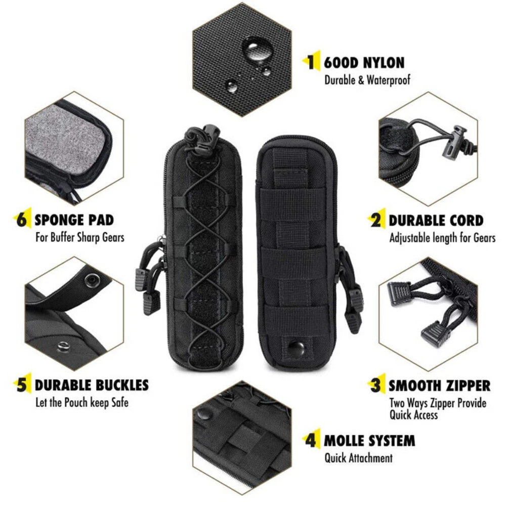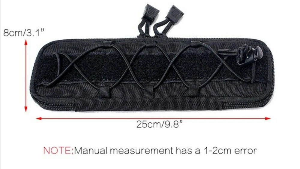 Features: 1. Made of high-quality synthetic fibers, which is wear-resistant and durable, and long service life. 2. Easy to carry, for using molle attachments, small molle pouch, tactical belt pouch, molle pouches tactical. 3. This is a compact design of the package, the shape of the bag is small and delicate, portable and lightweight. 4. The belt pouch has the adjustable elastic band and nylon clasp design which can fix the item firmly. 5. High quality and smooth zipper design ensures that things will not fall and easier to close and open bags. 6. The vest pouch can accommodate the tools and objects commonly used in outdoor travel, such as cutter, compasses, flashlight and other EDC tools. 7. The bag design with Molle system which can be directly hung through the waist belt on the waist, and can also be hung on the backpack, which is convenient to carry. Specifications: Material:1000D Nylon Color:Khaki,Army Green,Black Size: L:25x8x2.5cm/9.84*3.15*0.98inch Application:Travel,Hiking,Camping Features:Durable,portable,lightweight,wear-resistant,tear-resistant,waterproof Package included: 1 X Tactical Molle Knife Pouch(Knife is not included)