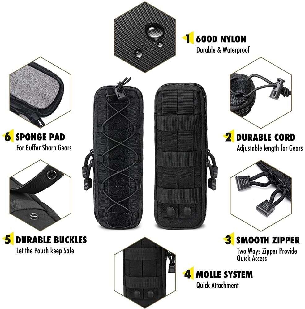 Product Description Features: 1. Made of high-quality Nylon, which is wear-resistant and durable, and long service life. 2. Easy to carry, for using molle attachments, small molle pouch, tactical belt pouch, molle pouches tactical. 3. This is a compact design of the package, the shape of the bag is small and delicate, portable and lightweight. 4. The belt pouch has the adjustable elastic band and nylon clasp design which can fix the item firmly. 5. High quality and smooth zipper design ensures that things will not fall and easier to close and open bags. 6. The vest pouch can accommodate the tools and objects commonly used in outdoor travel, such as cutter, compasses, flashlight and other EDC tools. 7. The bag design with Molle system which can be directly hung through the waist belt on the waist, and can also be hung on the backpack, which is convenient to carry. Specification: Material: Synthetic fibers & nylon Size: 25 x 8 x 2.5 cm Weight: 105g Material: 600D Nylon Fabric Color: Black / Khaki / Army Green Suitable for Camping,hiking,hunting,outdoor sports Package Included: 1 x Tactical Knife Sheath Bag