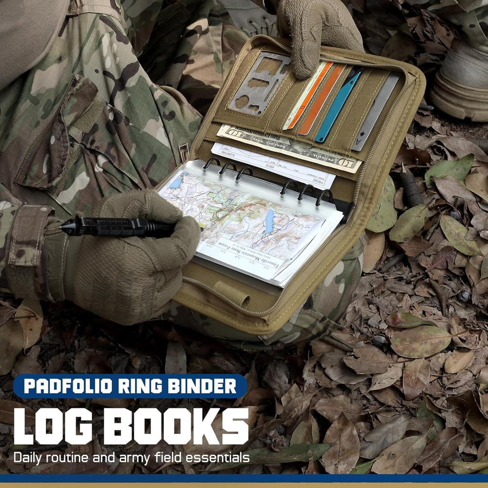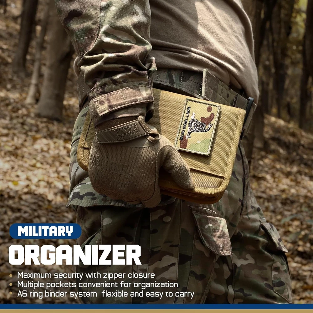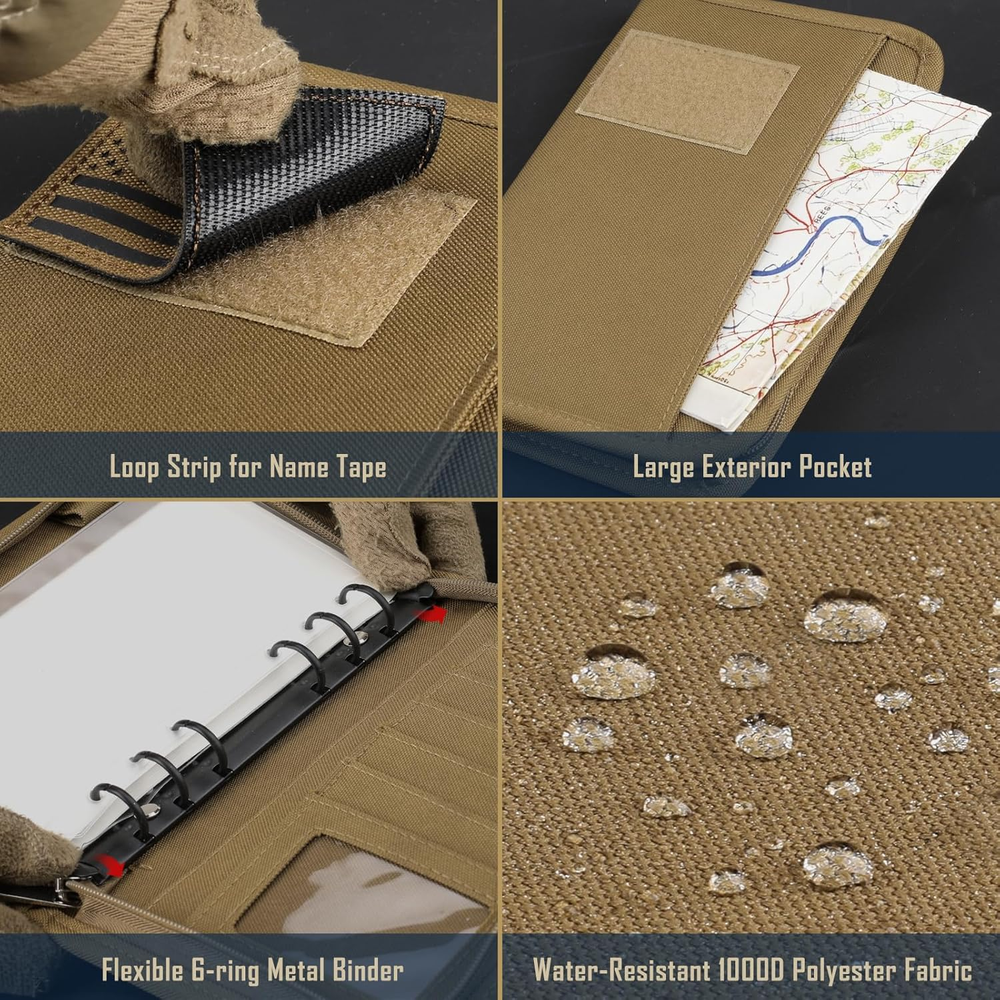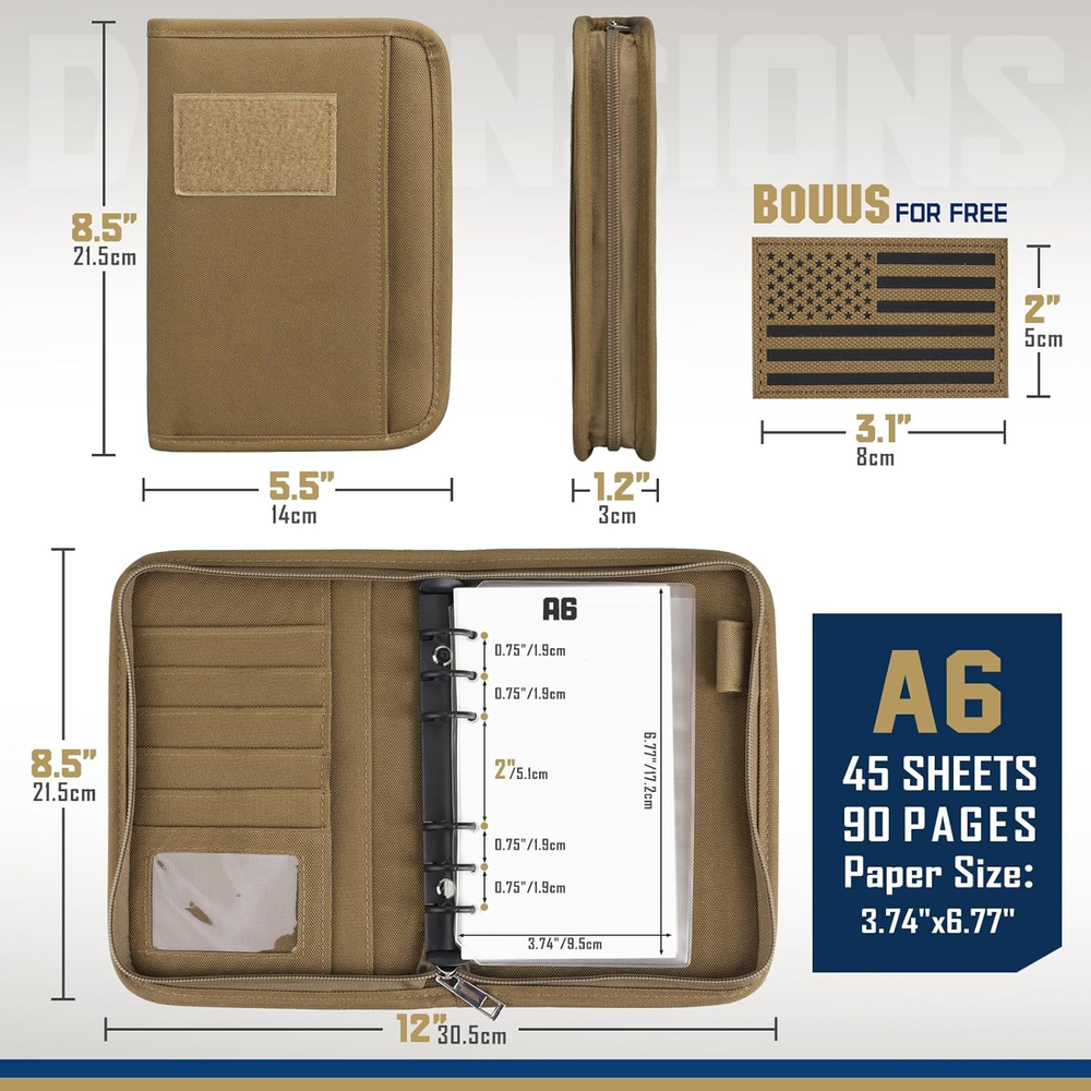 Store New Arrivals Add to Favorite View Feedback Contact Tactical Notebook Padfolio Ring Binder - Refillable 6-Ring A6 Binder, Zip Hardcover Notebook with 45 Pages, Water-Resistant Notebook Cover for Planners, College, Office, Field, Gift Description Item model number WY-0240K-A6(5.5 x 8.5 IN) Sheet Size 3.7 x 6.7(9.5 x 17.2 cm) Inches Product Dimensions 8.5 x 5.5 x 0.1 inches Number of Holes 6 Number of Items 1 Color Khaki Cover Material Polyester Material Polyester Material Type Polyester Manufacturer Part Number WY-240K-A6(5.5 x 8.5 IN) Item Weight 12.2 ounces Number of Dividers 8 Capacity 0.76 Pounds Size A6(5.5 x 8.5 Inches) Built for Endless Reuse-Refillable 6-Ring Binder:Features a metal 1-inch padfolio 6-ring binder. Includes 45 sheets (3.7" x 6.7") - Swap with A6 loose leaf paper (holds up to 200 pages). Perfect for custom setups- college notes, budget planners, conference records, field logs, and more.(Please measure the hole spacing) Portable A6+ Size for more Scenario: Portable A6+ size(5.5" x 8.5") of zip line notebook, fits tactical bag, briefcases, and backpacks. Conquer lectures, meetings, outwork, travel, fishing logs. Your ideas, story, armored on the go. Military-Grade Weather Protection: 1000D polyester water-resistant military notebook cover & dual zippers, shields documents from rain and dust. Secures cards, pens, and critical notes during outdoor missions, campus commutes, or business travel—never lose essentials again. All-in-One Organization: Multi-pocket combines external compartment + internal card slots/pen loop/clear photo pocket. Carry IDs, cards, tickets, maps, and pens, in one military-grade portfolio binder—ideal for teacher, executives, and outdoor professionals. Customizable Loop Panel (Includ A US Flag Patch): Personalize your tactical notebook binder identity with name/unit patches. Stand out in client meetings, training sessions, or field journal. Totally gift-ready: Unlock joy & creativity! This sleek zippered hardcover notebook makes the perfect gift – helping anyone declutter ideas and treasure every spark & story. Every inspiration deserves to shine! Product description Wynex Tactical Notebook Padfolio Binder Will Become A Partner In Your Daily Life The video showcases the product in use. The video guides you through product setup. The video compares multiple products. The video shows the product being unpacked. Tacitcal Notebook Ring Binder Merchant Video Notebook Binder is designed with multiple, strategically-sized compartments to securely hold your notepad, documents, pens, and tech accessories. Keep all your essential items neatly in one place, eliminating clutter and projecting a sharp, professional image. A6 Opening: Gently press down both ends Closing: Squeeze the metal ring tightly compatible both sizes of 6 ring A6 loose leaf papers. (Just need the hole spacing to be compatible) Show off your squad, name, or custom patches with magic hair strips. Get noticed instantly Exterior pocket for easy insertion and removal of loose papers and maps Durable and abrasion-resistant 1000D fabric cover, keeps documents & item secure in harsh conditions 1 Flexible Binder 2 Comparison Different A6 3 Hook & Loop Decoration 4 Crafted Front Pocket 5 Water-resistant Cover Specification Material ‎1000D Polyester Fabric Loose-leaf Papers Size A6 (3.74 x 6.77 Inches / 9.5 x 17.2 cm) Notebook Cover Size A6+ (5.5 x 8.5 x 1.1 Inches / 14 x 21.5 x 3 cm) ltem Weight 0.76 Pounds (345g) Line Loose-leaf Papers 45 Sheets 90 Pages‎ Number of Holes 6 Package Include 1 x Notebook Binders(A6+) , 1 x US Flag Patch Notes Heads up! The metal ring binder is fixed and undetachable. Notes Suitable for loose leaf paper which has 6 holes. A distance of 0.75 in / 1.9 cm between the closer 3 holes. And 2 in / 5 cm between the farther middle holes. Notes Please measure the hole spacing of your loose leaf paper. Different papers have different distances of the ring hole. Notes Hold up to 200 sheets of loose leaf paper. Suitable For A Wide Range Of Occation  Field Notebook Your Ideas, Preserved Anywhere. Built for Field Research & Adventure. College Notebook Your Notebook, Your Rules. Master Every Class. Ace Every Test. Daily Planner Swap out clear cash folders or budget planner papers. Focus all spending on maximizing ROAS. Busniess Notebook Glide Through Your Work. The meeting Notebook for Effortless Efficiency. Master Every Scenario: Engineered for professional, the portfolio binder is your reliable partner for business trips, academic classes, daily, travel and exploration. Check hole spacing: then easily swap in refill loose leaf papers — budget planners binder, grid, blank papers, and cash folders. Convenience On The Go Carrying it—whether by hand or in a backpack—is incredibly easy. Small binder ensures you are always prepared and organized, no matter where your day takes you. Practical Gift Ready to impress, this sleek notebook binder is an ideal gift for birthdays, graduations, holidays like Christmas, or professional milestones. Journal notebook is a thoughtful and appreciated present for graduates, teachers, colleagues, family members, and anyone who values style and functionality. Comparison of detailes for different sizes of binders Add to Cart Add to Cart Customer Reviews 4.6 out of 5 stars 154 4.6 out of 5 stars 154 4.6 out of 5 stars 154 4.6 out of 5 stars 154 4.6 out of 5 stars 154 4.6 out of 5 stars 154 Price $21.75 $ 21 . 75 $24.40 $ 24 . 40 $25.88 $ 25 . 88 $24.40 $ 24 . 40 — $23.88 $ 23 . 88 Loose-leaf Papers Size 3.74 x 6.77 Inches A5(5.6 x 8.25 Inches ) 3.74 x 6.77 Inches A5(5.6 x 8.25 Inches ) 3.74 x 6.77 Inches A5(5.6 x 8.25 Inches ) Notebook Cover Size 5.5 x 8.5 x 1.1 Inches 7.3 x 10.1 x 1.2 Inches 5.5 x 8.5 x 1.1 Inches 7.3 x 10.1 x 1.2 Inches 5.5 x 8.5 x 1.1 Inches 7.3 x 10.1 x 1.2 Inches Nearest ring distance 0.75 in / 1.9 cm 0.75 in / 1.9 cm 0.75 in / 1.9 cm 0.75 in / 1.9 cm 0.75 in / 1.9 cm 0.75 in / 1.9 cm Middle ring distance 2 in / 5 