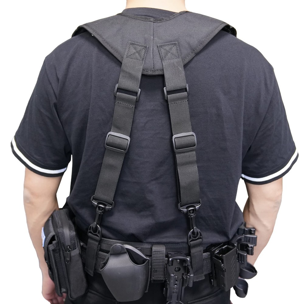 Military Suspender Your Tactical Belt Best Friend Come with Velcro Patch and Key Holder Tactical suspenders X Shape design easy put one and move off Tactical Harness with perfect size --- Ajustable shoulder strap and pads fit 5.0“ to 5.9”tall Good back support ---a wide four-point support for comfort and the underside is a Paded material to keep the wearer cooler Tough duty belt keeper can fit 2.25 inch duty belt.Good keepers: Our keepers have a solid plastic ring to allow the suspenders to be clipped to them. The keepers have hook and loop to keep them attached to your duty belt. The suspenders can be clipped or unclipped from the keepers easily and the keepers kept on your belt. TOTALLY RISK FREE - If you are not satisfied with your suspender,contact us any time,we will get you back within 24 hours try our best to make things right.