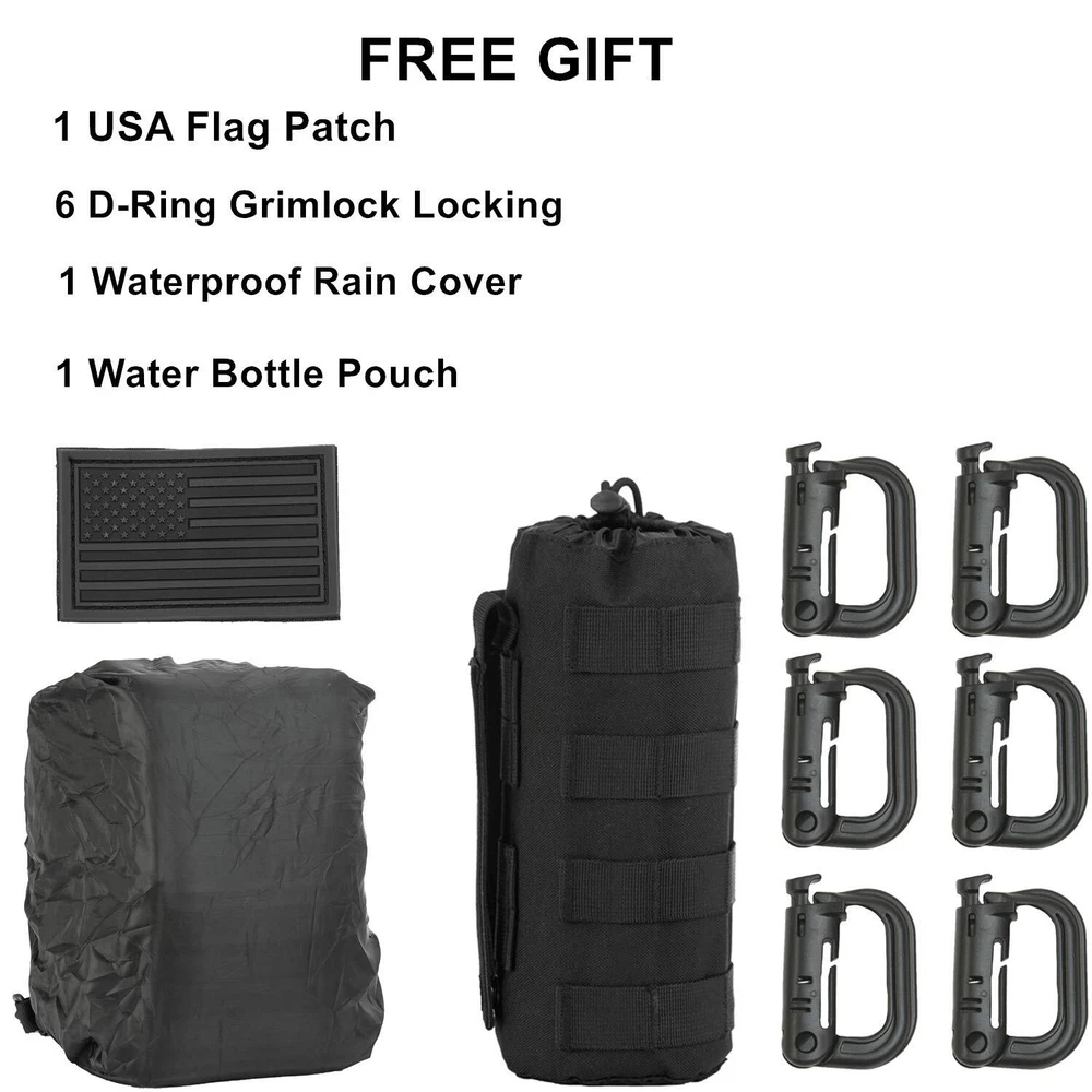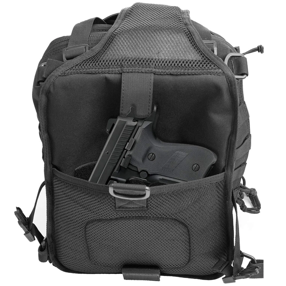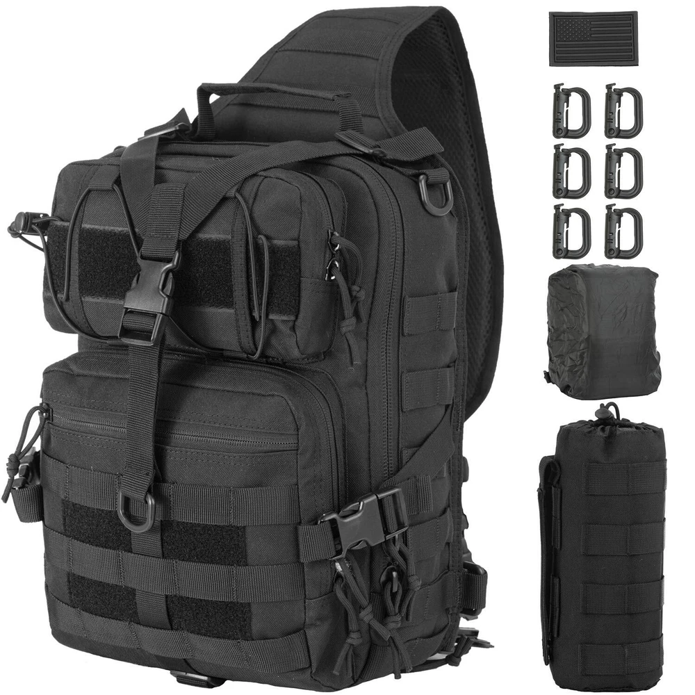 Please note that the waterproof rain cover is hidden inside the zipper pocket at the bottom of the sling bag. Open the zipper pocket on the bottom, you can find the waterproof rain cover. Come with 9 Pcs Accessories -- 1 x Water Bottle Pouch, 1 x USA Flag Patch, 6 x D-Rings Grimlock Locking, 1 x Waterproof Rain Cover. Please pay attention to the waterproof rain cover is hidden inside zipper pocket at the bottom of the backpack.Tactical sling pack with velcro in the concealed back compartment. Awesome as a pistol sling range bag for 1-2 handguns and lots of ammo or as tactical assault pack. Sling pack's size: 14 * 11.5 * 6.5 inch (H*W*D), enough for carrying 13"laptop,iPad, notepad, goggles, book, keys, wallet, cell phone, flashlight, gloves, water bottle, chargers etc on a daily basis. Tactical sling backpack has adjustable and comfortable single shoulder strap, and also has two smaller straps to help reduce the sway of the bag while moving as small military rover shoulder sling backpack.Heavy duty zippers and utility-style cord pulls, front load compression system-Y strap. Comfortable breathable padding back area, molle straps as molle tactical sling pack or edc bag. It's made of durable 600D polyster,water-resistant and durable.
