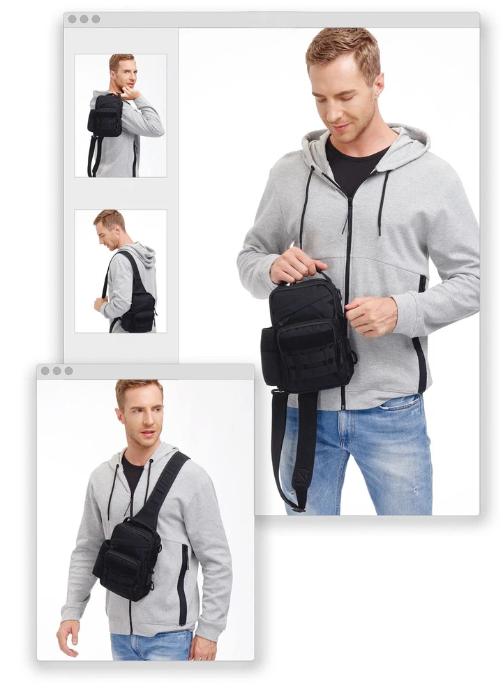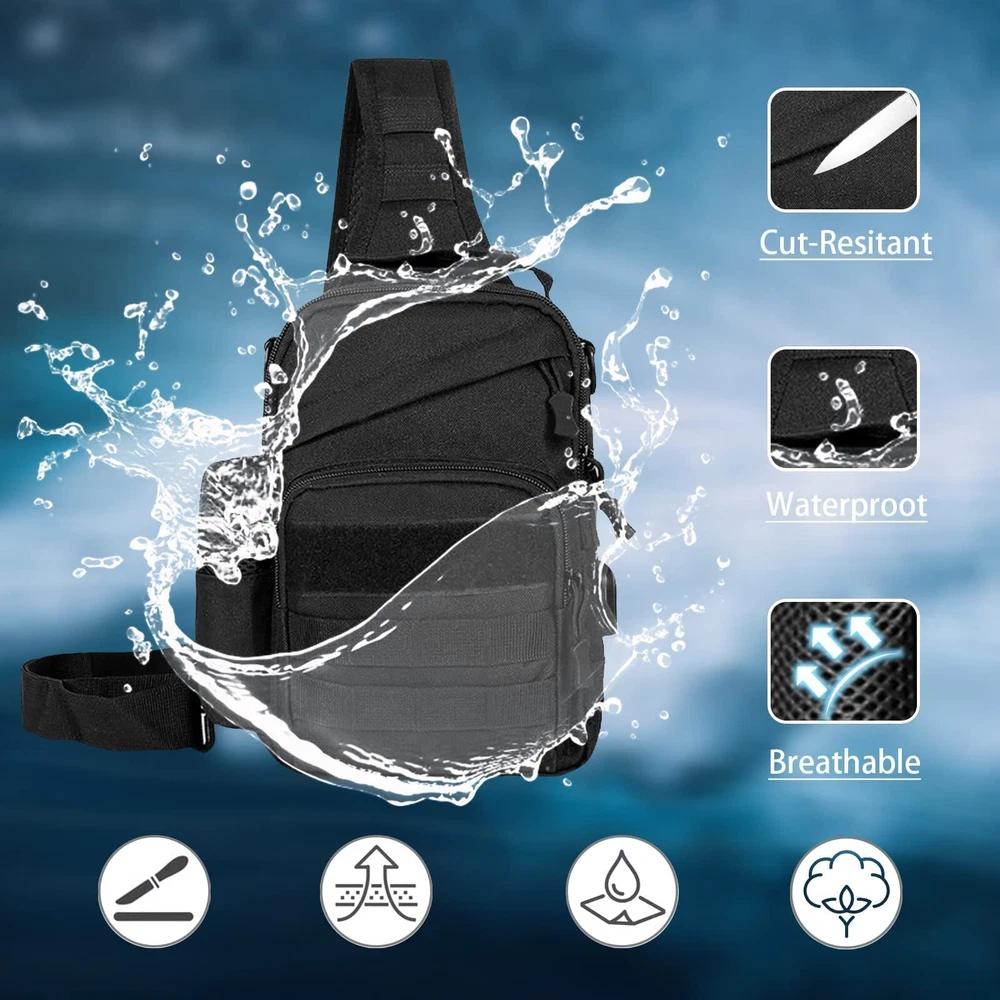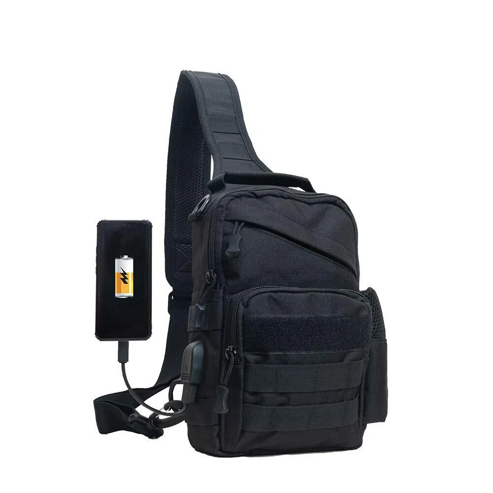 Description This tactical sling chest bag is suitable for all kinds of people. It has 1 main inter bag and 4 auxiliary pockets. The size is 6.69 * 2.75 * 9.84 inch (L * W * H). The external USB port charging design, free your hands Because of the large capacity, so you can put your iPad mini , cell phone and some daily necessities stuffs. MOLLE system bag can use it flexibly. It is a good choice for your travel or outdoor activities or daily use bag. Package: 1 x Tactical Chest Sling Bag If you have any problems, please contact us, we will try our best to help you. Tip: This item is a small bag, please pay attention to the size before purchase The tactical sling backpack is constructed by the high quality 600D oxford nylon material and SBS zipper, which is wear-resistant .Main bag size: 6.69 * 2.75 * 9.84 inch (L * w * h), weight: 380g, light and small, easy to carry The external USB port charging design, free your hands, can charge your mobile phone at anytime and anywhere. The tactical small sling bag includes 1 main inter bag and 4 auxiliary pockets. The main inter pocket can hold your iPad mini, Kindle and other large items. The extra front pocket can hold cell phones, napkins, headphones, keys, charging cables and other small things. The remaining two hidden pockets can be put into valuables, which are not easy to lose. The side mesh can be used for flashlight, water bottle, paper, etc. The tactical sling bag is equipped with an external MOLLE system, you can easily load other devices according to your requirements. Suitable for hiking, running, cycling, walking, camping, mountaineering, fishing, hiking, tourism, horse riding, cycling and other sports activities.