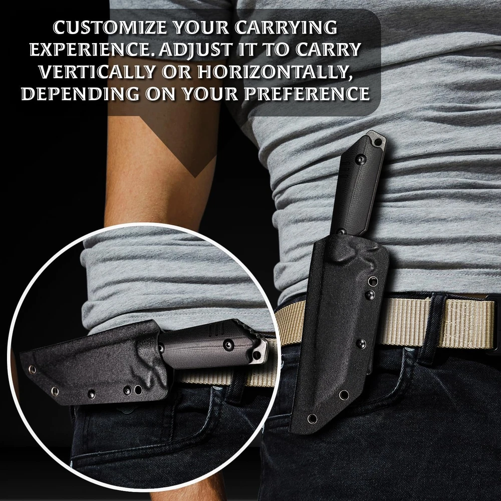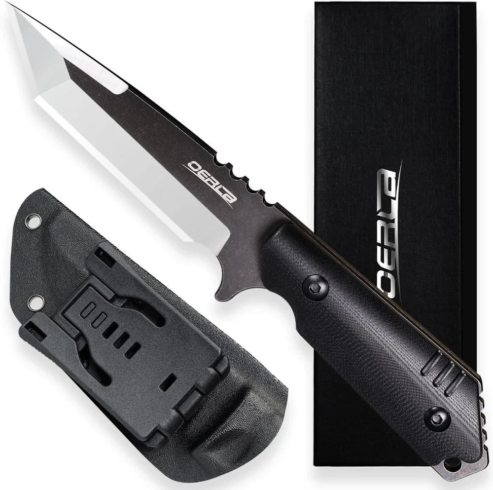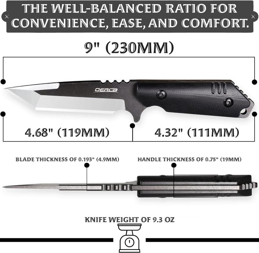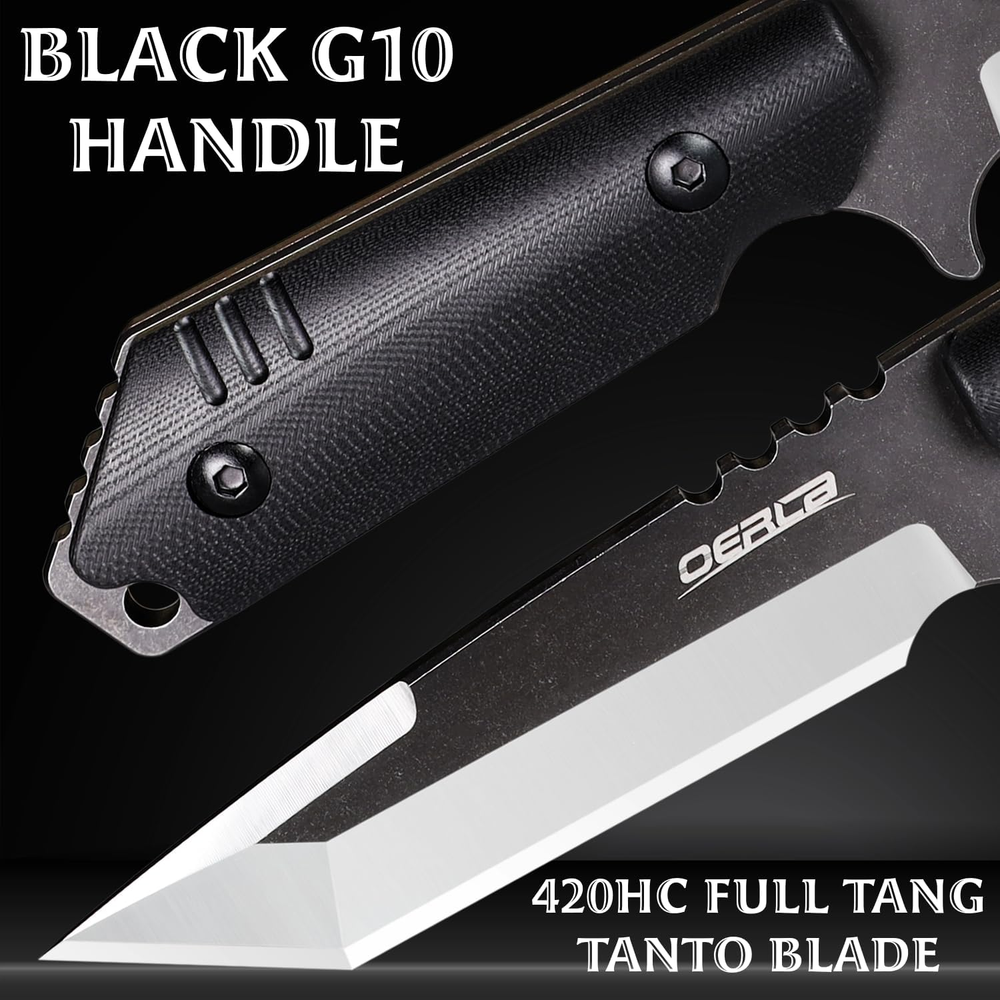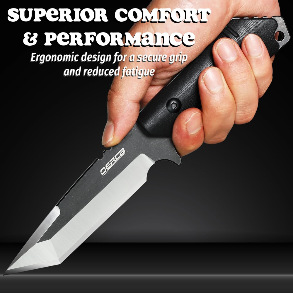 DIMENSIONS: 9" (230 mm) overall, 4.68" (119 mm) of Blade length, 4.32” (111 mm) of handle length, 0.193”(4.9 mm) of Blade thickness, 9.3 ounces of knife weight MATERIAL: Blade is made of reliable 420HC steel provides razor sharp cutting with a black G10 handle the deep index-finger indentation providing an extremely secure grip, non-slip. accord with human body engineering for superior hand control, agility, and comfort. DESIGN: OERLA outdoor duty fixed blade knife is designed by an retired veteran who is working with our manufacturer, the perfect blade radian and force is more suitable for your cutting. Precise cryogenic tempering increases the steel's crystalline structure, enhancing strength, flexibility and hardness, and the ability to hold a keen edge over time. FEATURE: The best outdoor camping hiking knife you are looking for. Multiple carrying methods, lanyard hole and high-strength lightweight kydex material sheath for easy portability. The end of handle can be multi-purpose such as glass breaker WARRANTY: OERLA knives include a limited 1year manufacturer's warranty against defects in materials and workmanship. Product Description Description If you are a fan of fixed-blade field knives or want a fixed-blade knife, you will appreciate OERLA OLX-004 Tanto outdoor fixed-blade camping hunting knife. Crafted with a 420HC steel blade that has undergone Precise cryogenic tempering, this knife offers exceptional strength, flexibility, and hardness for razor-sharp cutting power and easy maintenance. The G10 handle ensures lifelong durability and is specifically designed for superior hand control, agility, and comfort. Plus, it is impervious to heat, cold, and sweat, with a black stonewashed on flat and 3-step water grinding bevel and edge method along with bleeding edge technology which maintains a perfectly controlled sharpness at a 17-degree angle per side of the edge to provide all the sharp cutting edge you need for any task. The lightweight Kydex sheath is durable and reliable enough to securely hold a sharp blade and withstand harsh conditions. It also features a universal clip that can be adjusted horizontally or vertically carry. The removable & adjustable spacers on the clip fit it to any belt width and are compatible with most various belts, shoulder straps, bootstraps, and backpacks for easy portability. The hole on our Kydex knife sheaths matches all industry-standard clips. Providing the flexibility to customize and modify your kit with different attachments and buckles as needed. Ideal for all your outdoor adventures. Whether camping, hunting, bushcraft, fishing, or EDC, OERLA knives are always ready. Also, Its cool and sleek appearance makes it the perfect gift for yourself or the men in your life. 420HC Steel The razor-sharp cutting edge of cost-performance Hold a keen edge and provides all the razor-sharp cutting you need, and easy to maintain G10 Handle Lifelong Durability Engineered for superior hand control, agility, and comfort. Impervious to heat, cold, and sweat. Full Tang with Jimping Improved Durability Provide better balance and control precision when cutting, chopping, and slicing. More Safety Keep the knife secure and prevent accidental loss Ensure the security and safety of your intended purpose with a lanyard hole. Kydex Knife Sheath Strong and Tough Durable and reliable enough to securely hold a sharp blade and withstand harsh conditions. 1 The Blade 2 The Handle 3 The Spine 4 The Lanyard Hole 5 The Sheath Comfortable horizontally or vertically carry vertically carry Horizontally carry / Scout carry ULTRA SHARP ULTRA ESSENTIAL OERLA Knives’ supreme quality meets stunning prices Great for EDC and outdoor activities, survival gear, car emergency kit, camping, hunting, hiking, bushcraft, etc. The most popular with the men's gift! Unlock Your Next Exciting Journey with OERLA’s Outdoor Knives OERLA Fixed Blade Knives Add to Cart Add to Cart Add to Cart Add to Cart Add to Cart Add to Cart Add to Cart Customer Reviews 4.7 out of 5 stars 1,340 4.6 out of 5 stars 270 4.7 out of 5 stars 958 4.6 out of 5 stars 1,381 4.7 out of 5 stars 1,192 4.6 out of 5 stars 929 4.6 out of 5 stars 2,044 Price $31.99 $ 31 . 99 $34.99 $ 34 . 99 $29.99 $ 29 . 99 $28.99 $ 28 . 99 $28.50 $ 28 . 50 $29.75 $ 29 . 75 $28.50 $ 28 . 50 Blade material 420HC steel 420HC steel 420HC steel 420HC steel 420HC steel 420HC steel 420HC steel Blade Hardness 56~58 HRC 56~58 HRC 56~58 HRC 56~58 HRC 56~58 HRC 56~58 HRC 56~58 HRC Handle material G10 Handle G10 Handle Glass-Filled Nylon Handle G10 Handle G10 Handle G10 Handle G10 Handle Overall length 9-inches (230mm) 9-inches (230mm) 9.45-inches (240mm) 7.87-inches (200mm) 9.45-inches (240mm) 7.87-inches (200mm) 7.87-inches (200mm) Blade length 4.68-inches (119mm) 4.56-inches (116mm) 4.88-inches (124mm) 3.8-inches (97mm) 4.65-inches (118mm) 4-inches (101mm) 4-inches (101mm) Handle length 4.32-inches (111mm) 4.48-inches (114mm) 4.57-inches (116mm) 3.74-inches (95mm) 4.8-inches (122mm) 3.87-inches (99mm) 3.87-inches (99mm) Knife weight 9.3 oz 8.6 oz 9 oz 6.5 oz 9 oz 7.9 oz 7.2 oz