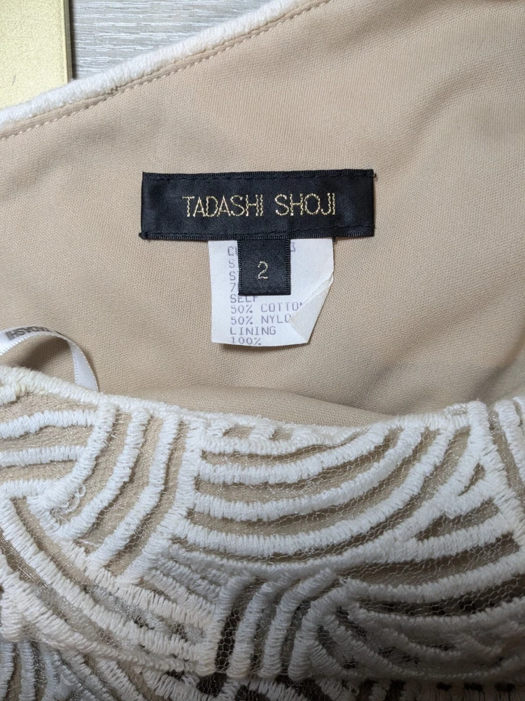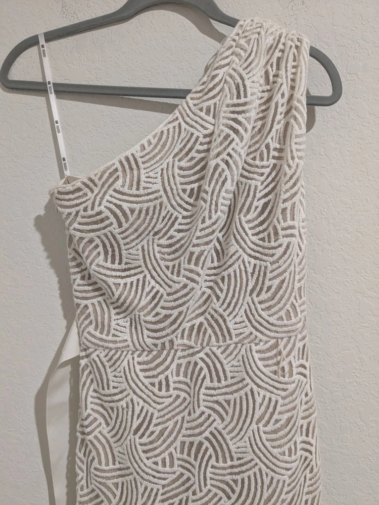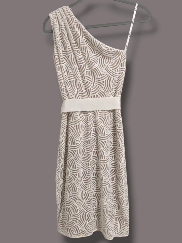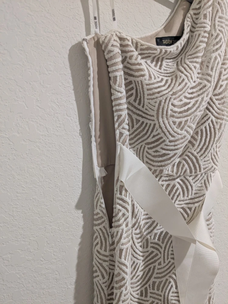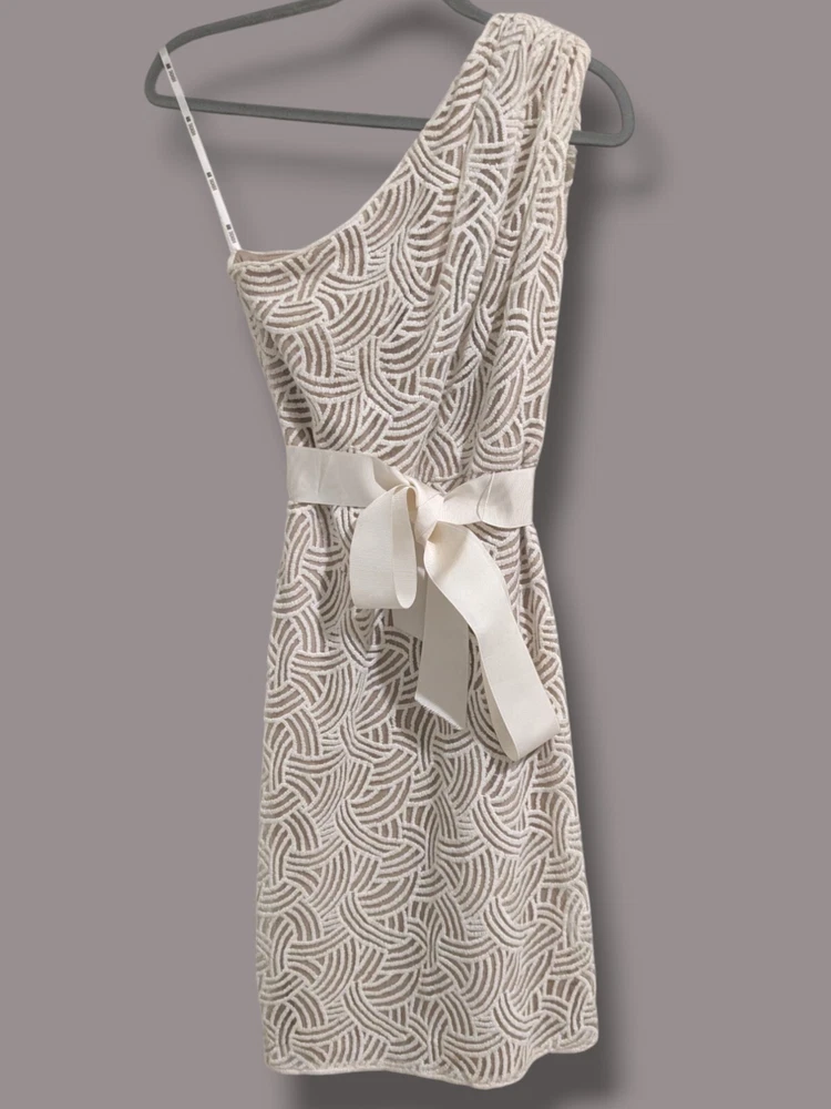 Tadashi Shoji White Cream Embroidered One-Shoulder Belted Tie-Waist Sheath Dress Elegant Classy Evening. Great pre-owned condition overall, aside from minor flaws. Size 2. Has some stretch. Fully lined. Soft embroidery. Soft and smooth interior. Polyester lining. Belt is sewn in. *Faint stain at front hem - not easy to notice due to the detailing of the dress. *Very faint stain on back hem, left side of seam. *Faint discoloring at both armpits. Length: 37" Pit to pit: 15" Waist: 12"