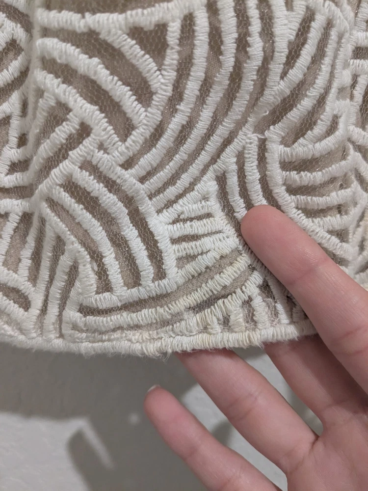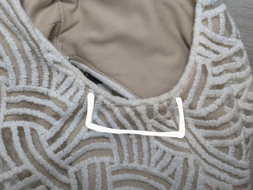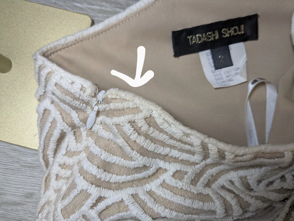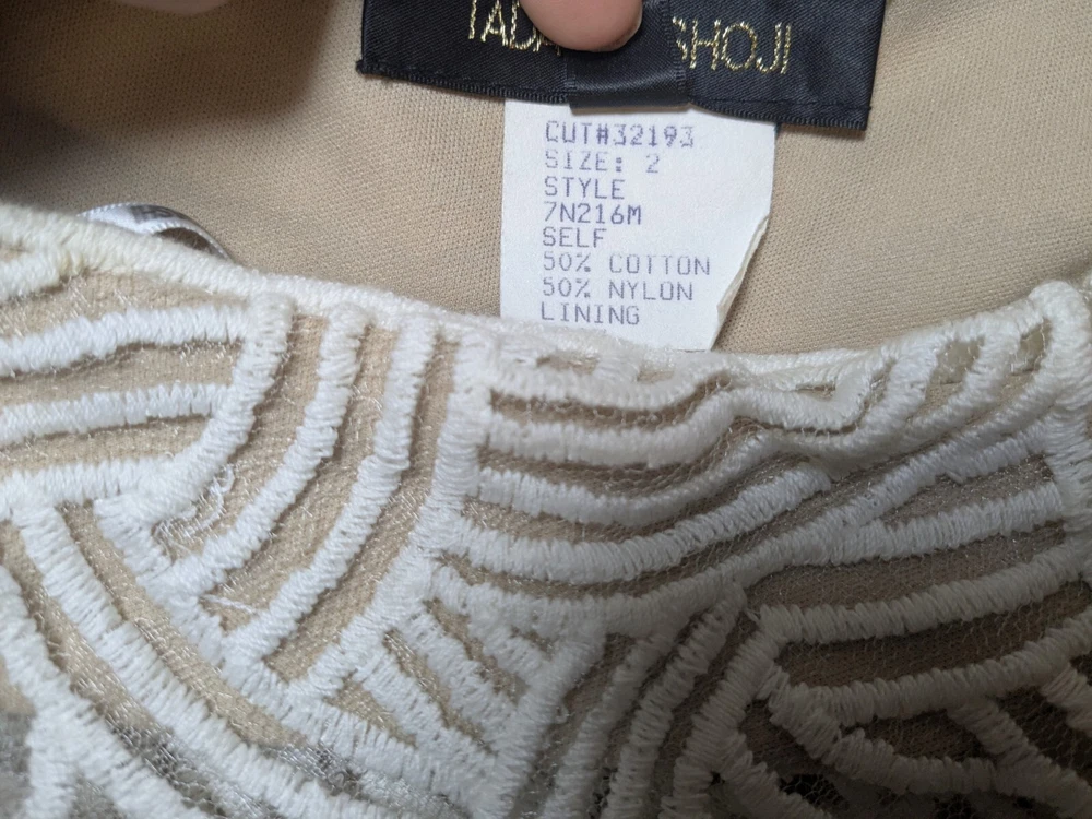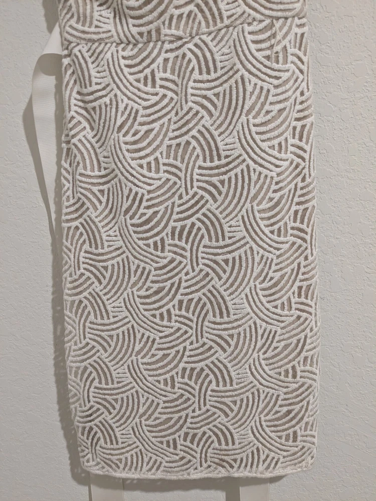 Tadashi Shoji White Cream Embroidered One-Shoulder Belted Tie-Waist Sheath Dress Elegant Classy Evening. Great pre-owned condition overall, aside from minor flaws. Size 2. Has some stretch. Fully lined. Soft embroidery. Soft and smooth interior. Polyester lining. Belt is sewn in. *Faint stain at front hem - not easy to notice due to the detailing of the dress. *Very faint stain on back hem, left side of seam. *Faint discoloring at both armpits. Length: 37" Pit to pit: 15" Waist: 12"