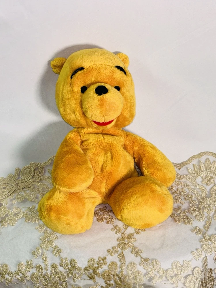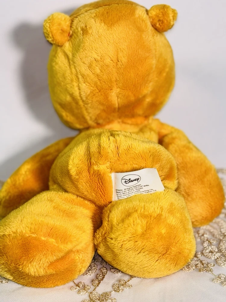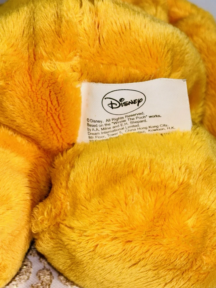 This is a Disney-branded plush beaned toy featuring the character Winnie the Pooh. It is tagged by Disney and showcases a smiling expression. The stuffed animal is original and authentic, making it a collectible item for fans of the Disney franchise and Winnie the Pooh.