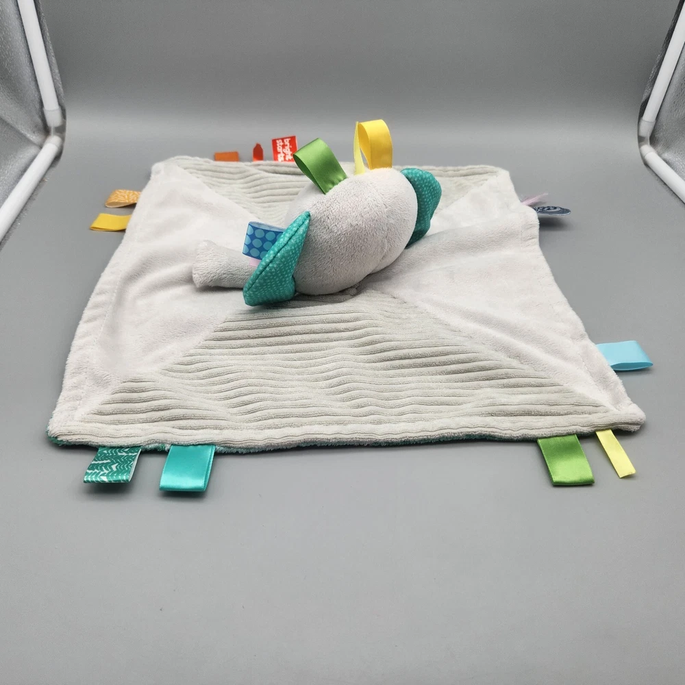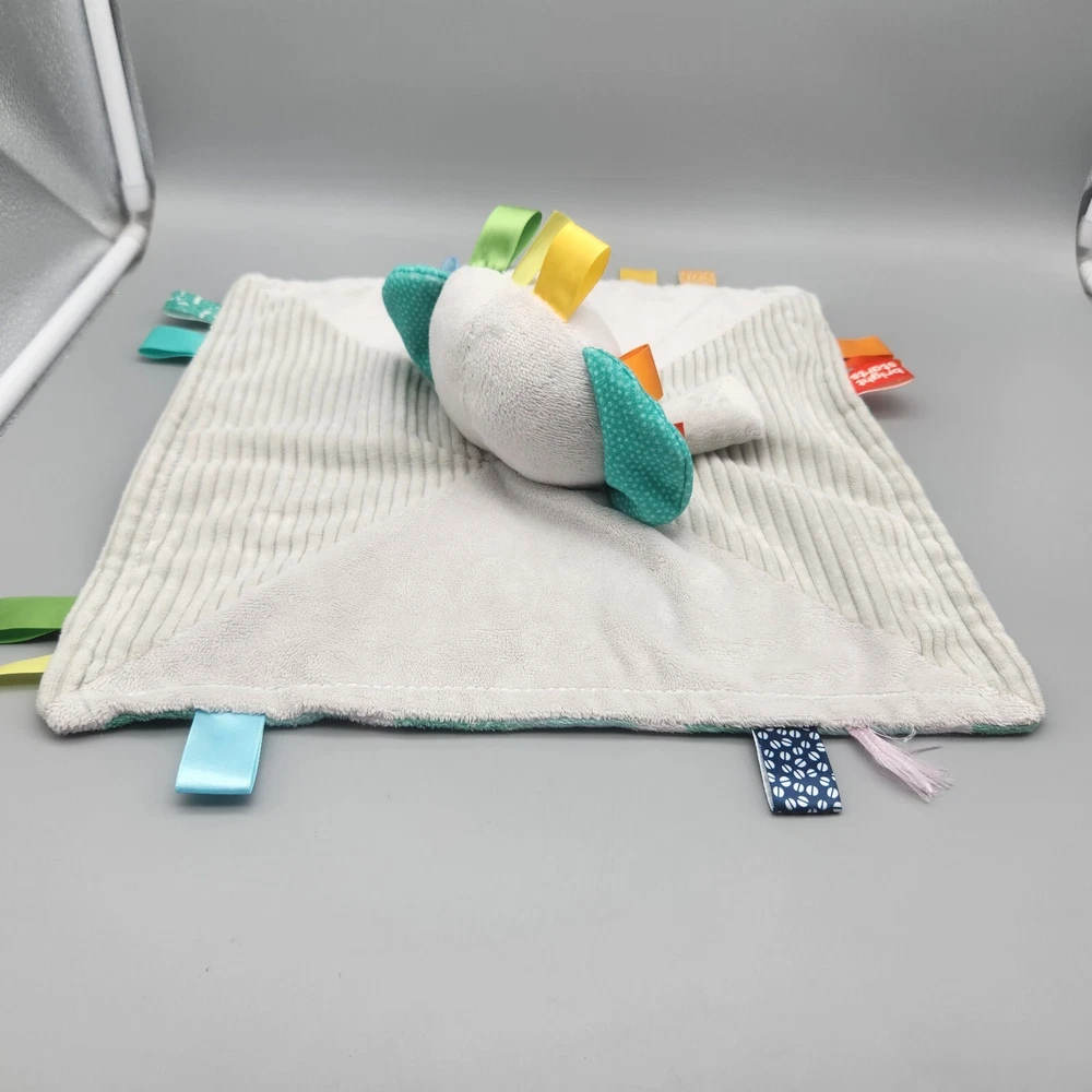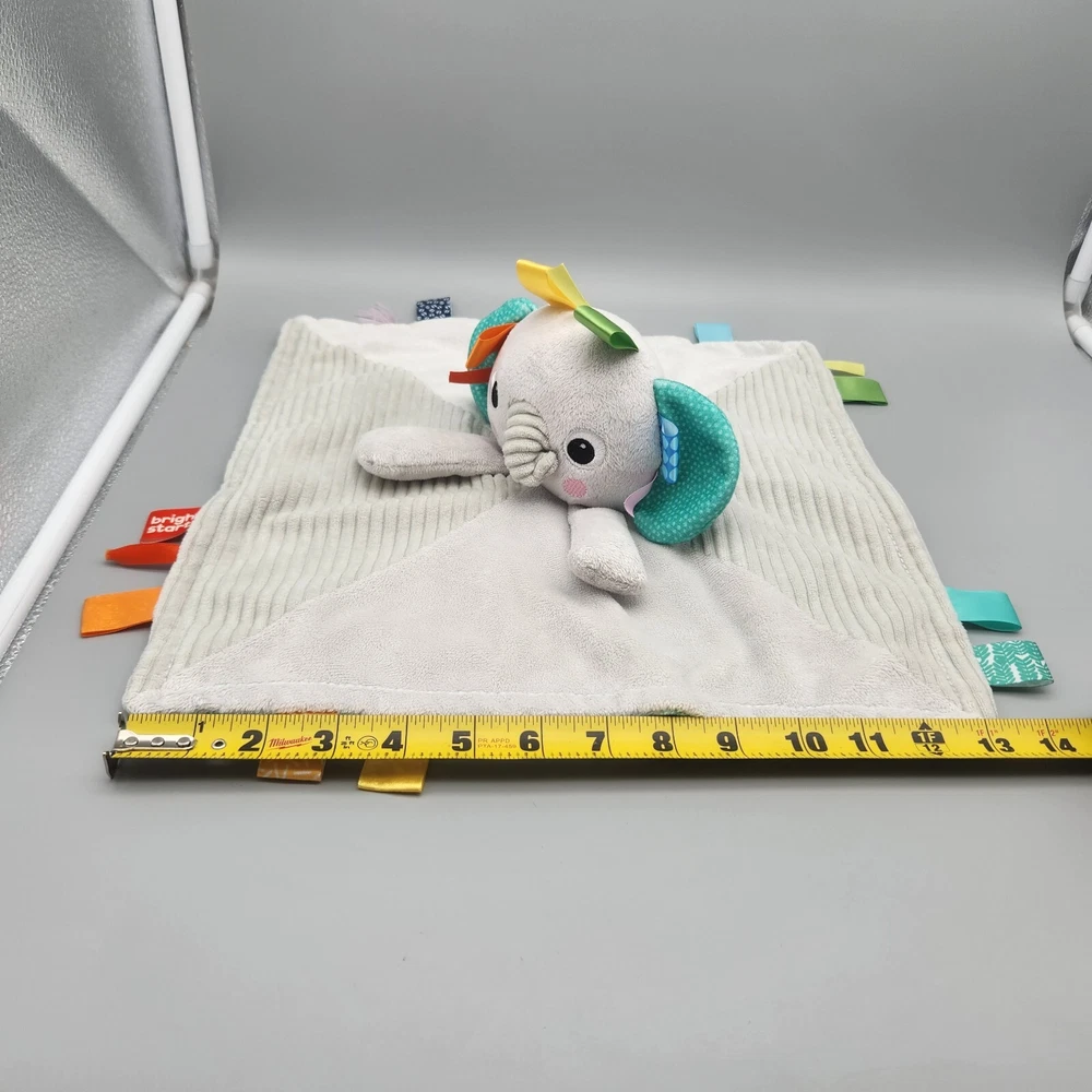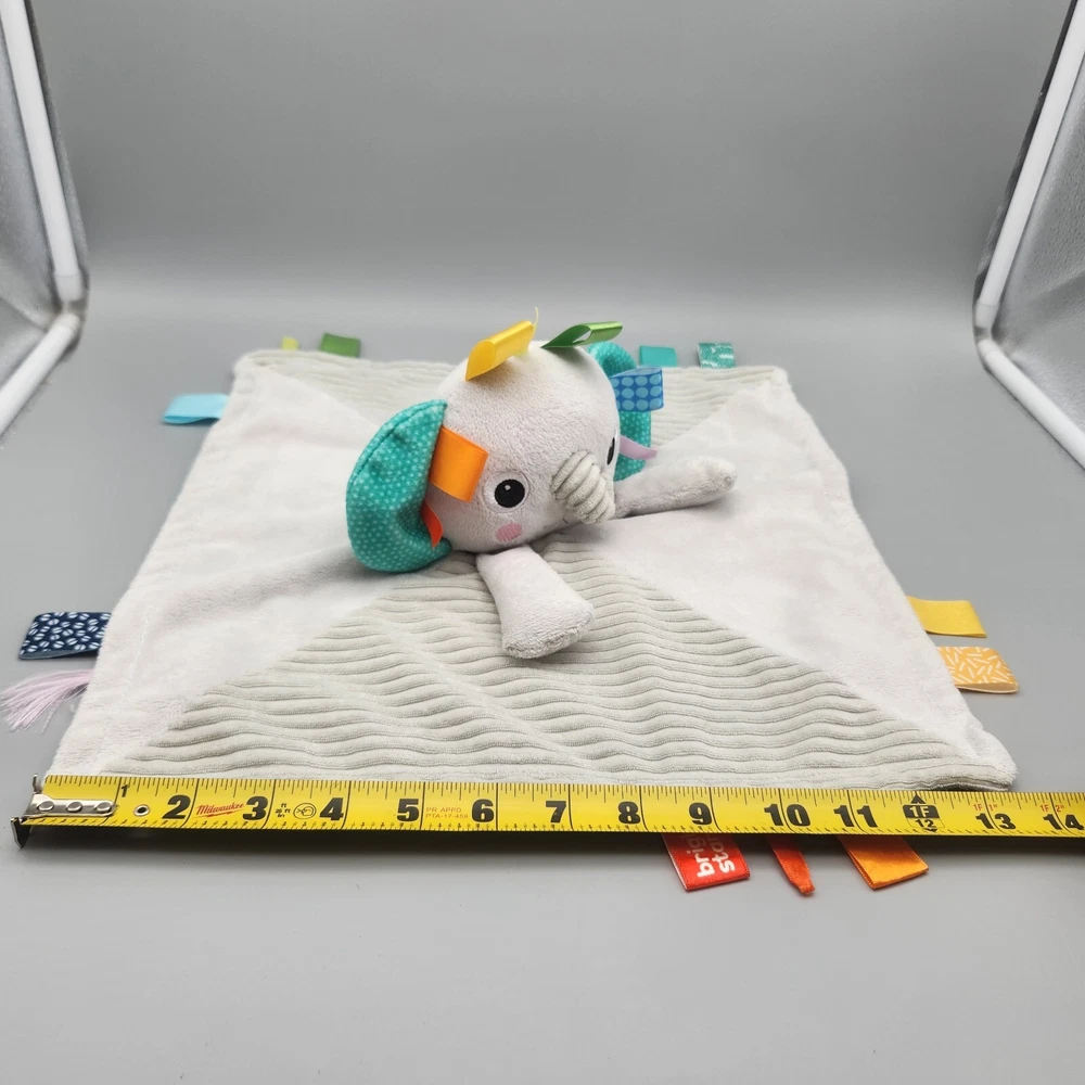 Taggies Elephant Baby Lovey Security Blanket Gray Teal Bright Starts Plush Toy 13"x13" Good gently loved pre-owned condition. One of the tags is frayed, and there is no tush tag. See photos for details. Super cute.