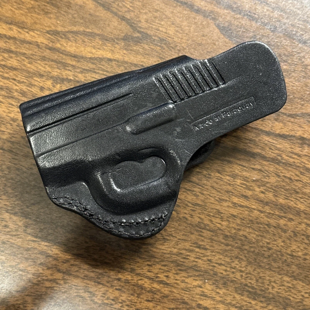 The Tagua Inside The Pants Holster is designed for the Kahr Arms P380 pistol, made of black leather for right-handed shooters. This concealment holster is specifically crafted for inside the waistband (IWB) carry at the 3 o'clock, 4 o'clock, 2 o'clock, or 5 o'clock positions. It features a clip attachment for secure placement and is lightweight, weather-resistant, and water-resistant, making it suitable for shooting activities. This model is manufactured in Paraguay by Tagua and offers level 1 retention for easy access to your firearm during use.