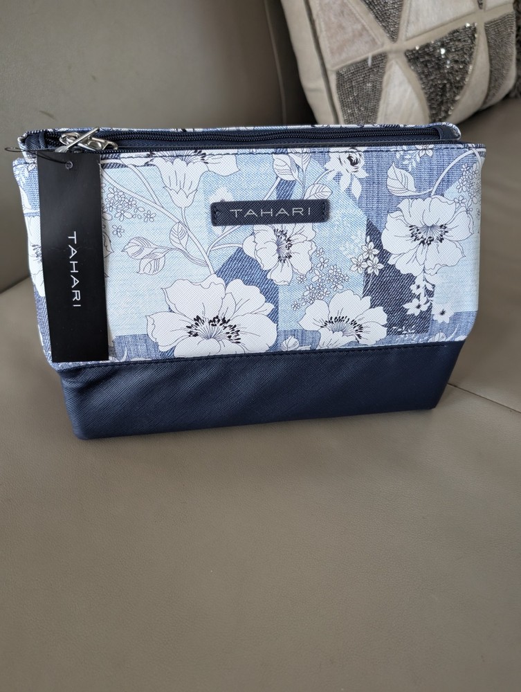 Tahari Pyramid Cosmetic Travel Bag Trifold for Makeup In Blue And White.