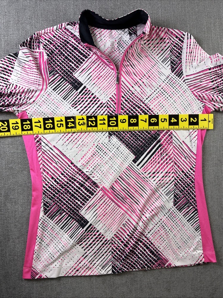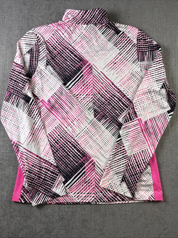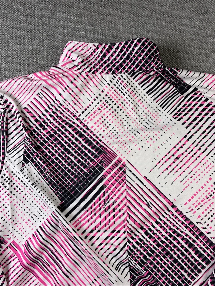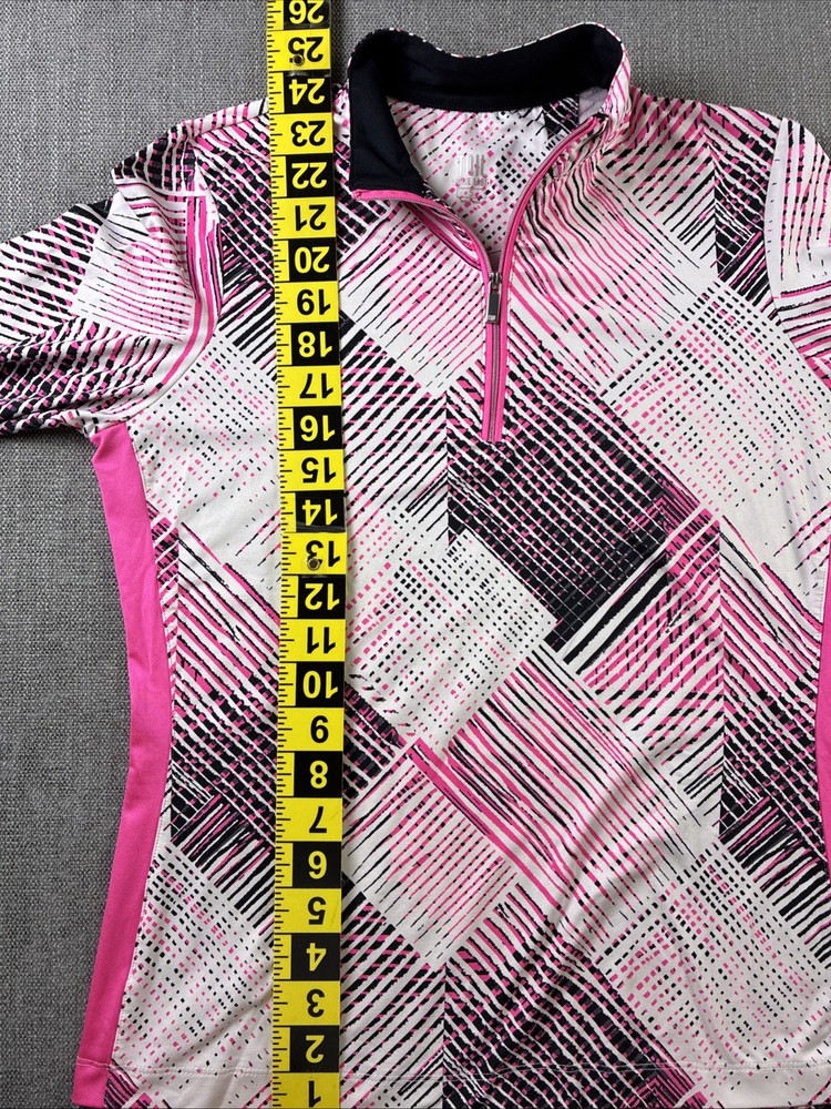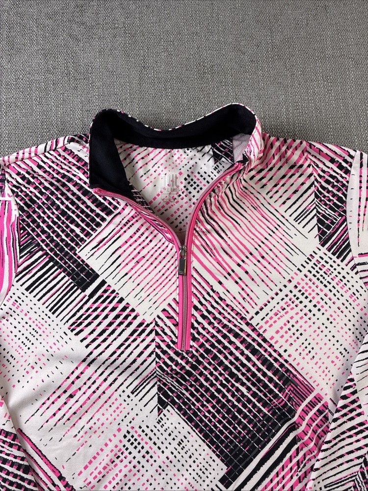 The Tail White Label 1/4 Zip Pullover is a versatile activewear top perfect for various activities like golf, pickleball, running, and more. Made from a blended fabric of polyester and spandex, this pullover features a mock neck and long sleeves for added comfort and warmth. The pullover style with a 1/4 zip closure makes it easy to put on and take off, while the geometric pattern in colorful hues adds a pop of personality to your outfit. Ideal for all seasons, this pullover is machine washable for easy care and is designed for an athletic fit for optimal performance during your workouts. Refer to photos for measurements