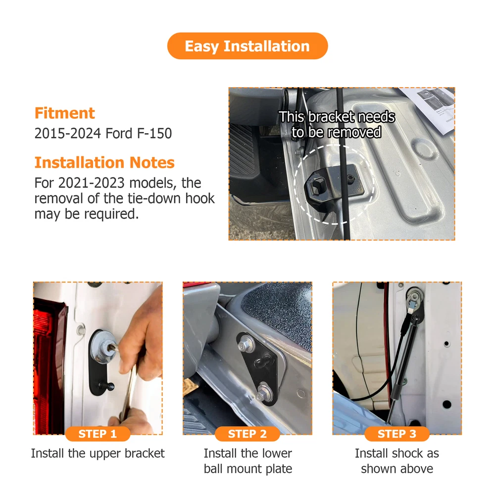 product Specification Product description: Type:Struts Placement on Vehicle:Rear Material:steel Features:Tailgate Assist Manufacturer Part Number:TA-70303017 Fitment: For 2015-2024 Ford F150 Notes: For 2021-2023 models, the removal of the tie-down hook may be required. Note: Communication is the best way to solve problems. If you have any problems with the product you received, please contact us before contacting eBay or leaving a review. We will provide a satisfactory solution for you. *Please CHECK OEM Part Number before order* *Installing Template is NOT Included, Professional Installation Is Highly Recommended* Express Delivery Time 1 We ship to worldwide,except Hong Kong,Taiwan,Macao,China,Guemsey,Puerto Rico and we do not ship to APO/FPO, etc. 2 Item will be shipped within 3 business day on payment received. 3 Items are shipped from China using Airmail,reach most of countries within 10-20 business days. 4 sDelivery time depends on destination and other factors,it may takes up to 20 business days. Payment Method 1 We accept Paypal only. 2 All major credit cards are accepted through secure payment processor PayPal. 3 Payment must be received with 7 days of auction closing 4 If you have bought multiple items from us,you can send us one payment for all the items instead of paying for them individually. When you click the Pay Now button,eBay will automatically determine if there are other items you have won of purchased from us and will combine them for your review. After-sales Policy 1 One year warranty!30 days money back!Buy with confidence! 2 If you are not satisfied when you receive your item,please return it within 30 days for a replacement or money back.Please contact us before you return the item. 3 If item is defective in 3 months,we will send you a replacement without extra charger,or offer refund after we receive the defective item. 4 If item is defective after 3 months,you can still send it back to us.We will send you a new one after after receiving the defective item,but you have to pay the extra shipping fee. Other 1 We are not responsible for any custom duty or import tax. 2 We will leave Positive Feedback after receiving the payment.Please contact us if you are not satisfied with the item after receiving it. 3 All mails will be answered within 1 business day.If you do not receive our reply,please kindly re-sent your email and we will reply you as soon as possible. 4 Serious Buyer Only!Please place bid only if you agree with all the terms.