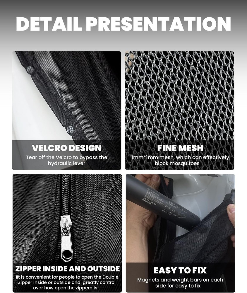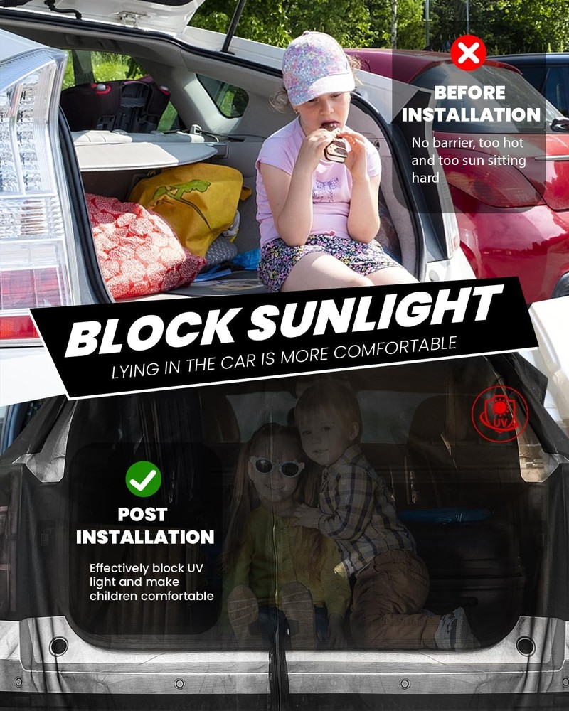About this item 【Easy to Install & Carry】The car tailgate net is made of simple fixing devices and lightweight materials, making it easy to install and carry quickly without adding too much burden to the vehicle. Enable you to easily and quickly build camping areas. 【Convenient & Practical Mesh Design】The tailgate mesh of the car adopts a mesh structure, which can maintain ventilation and breathability in the trunk, allowing campers to have a more comfortable resting environment inside the car. 【Flexible Use of Space】The tailgate net of the car fully utilizes the rear compartment area of the vehicle, providing additional rest space, allowing you to fully recover your physical strength. At the same time, there is no need to book camping locations or accommodations, saving camping costs. 【Insect prevention function】The 1mm * 1mm fine mesh structure of the car tailgate net has a certain insect prevention effect, allowing you to sleep in the trunk environment without being disturbed by pests, and to explore nature more freely and enjoy the fun of camping. Package Dimensions: 67"L x 59"W