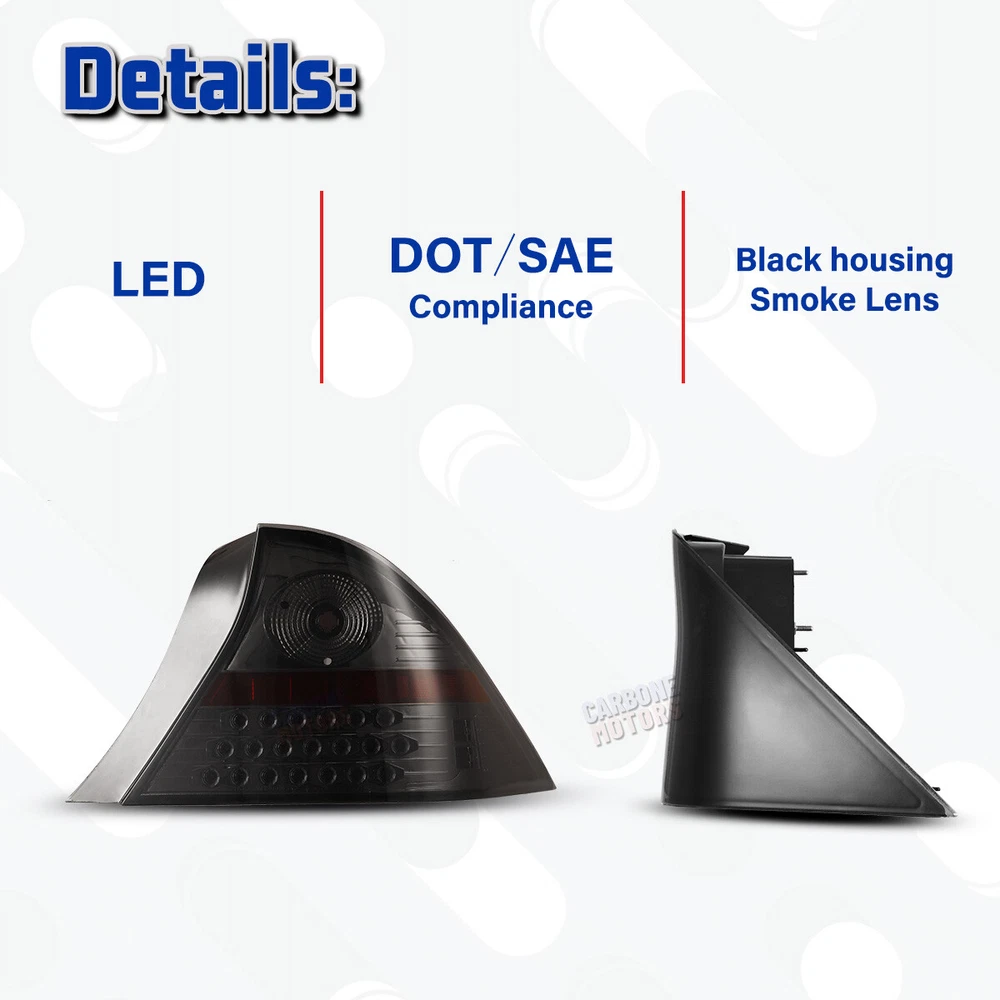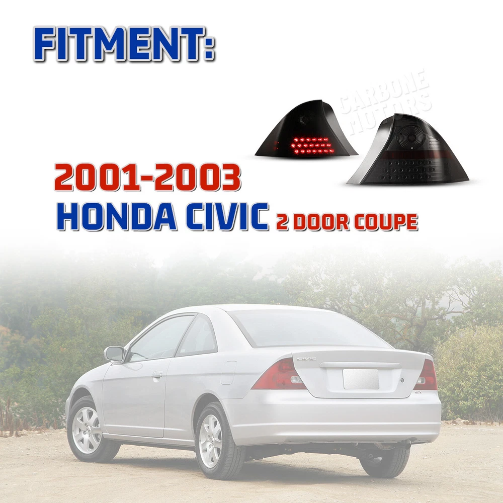Taillights LED For 01-03 Honda Civic Coupe Black/Smoke Turn Signal Brake Lights 🔔 Black Housing & Clear Lens: Click here Specification Reverse Light Bulb : Not included (backup lights use the stock bulbs or the original lights of car) Brake Light Bulb : LED Turn Signal Light Bulb : LED Parking Light Bulb : LED Wiring Harness : Not included (Plug and Play) Certification : DOT/SAE Color Finish : Black housing / Smoke lens Replace Original (OE) Part # : L: 33551S5PA01; R: 33501S5PA01 Partslink: L: HO2800134; R: HO2801134 Fitment For 2001-2003 Honda Civic 2 Door Coupe NOT Compatible with Hatchback & Sedan Models Package Includes 1 Pair of LED Taillights (Left and Right Side) Payment Delivery details Terms of sales About us Contact us Payment We ACCEPT PAYPAL, CREDIT CARD, APPLE PAY & GOOGLE PAY etc. Delivery details We normally despatch your order within 1-3 working day upon cleared payment. Please double confirm your address and contact information and ensure that it's available for you to receive your package. We'll ship out your item for free shipping within 48 states . Also, please noted that we do not offer local pick up service . NOTE: buyers who purchase international products need to pay import tariffs !!! Terms of sales 60 days return service is provided. If you do not satisfy with our items, please return back to us within 60 days in its original condition, then we'll issue the full refund to you ASAP. **If you received an incorrect, damaged, defective, or item not as described, or not satisfied with the product, contact us for a partial/full refund or replacement on our cost. ** Professional installation is highly recommended About us Wolfx_Offroad is a direct factory sale from manufacturer of auto parts with well-equipped testing equipment and strong technical force. We are selling headlights, tail lights, fog lights and more auto parts . Follow us and get your favourite item! Contact us Any questions or problems about our products, please do not hesitate to contact us by eBay message or click the " Contact Seller " on the right side of the product's interface. We'll reply you as soon as we can. If you are satisfied with our service and product, please kindly leave a positive feedback .