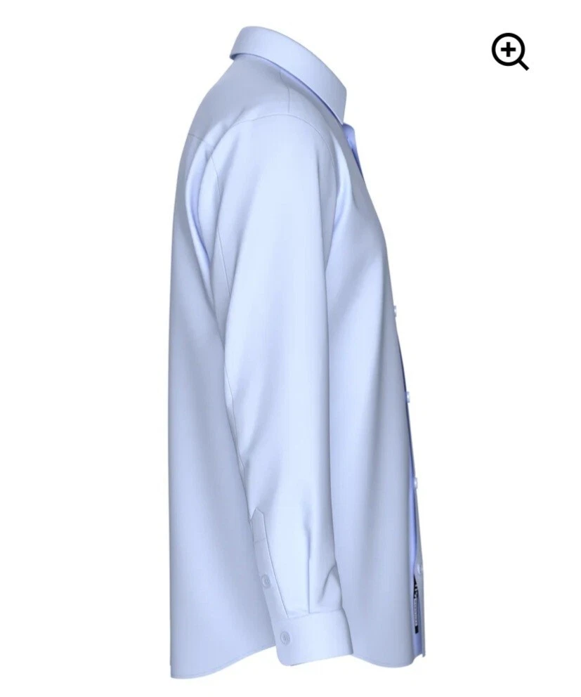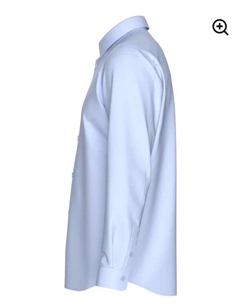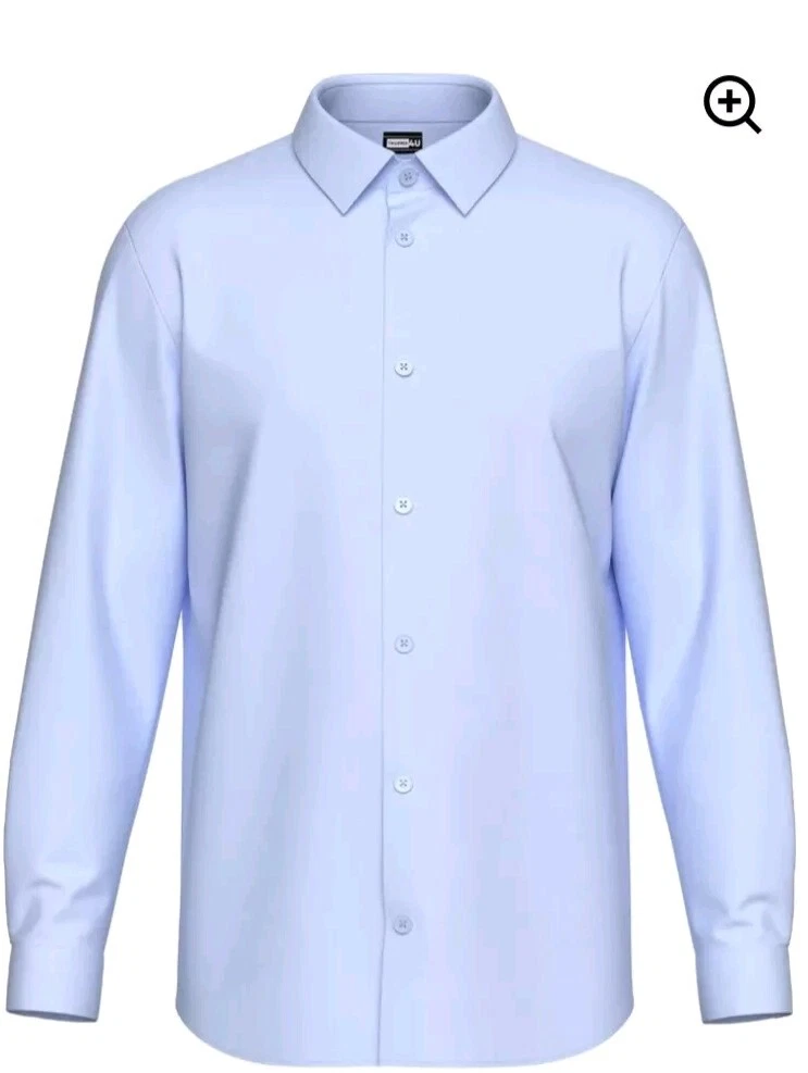 This tailored dress shirt is in a sky blue color with a solid pattern, featuring a collared neckline and button closure. It is made from a comfortable 82% nylon and 18% spandex material with a 4-way stretch for flexibility. The shirt has long sleeves with barrel cuffs and is suitable for various occasions such as travel, weddings, parties, work, and more. It is machine washable and designed for a regular fit in size Medium, making it a breathable and versatile option for business or casual wear.