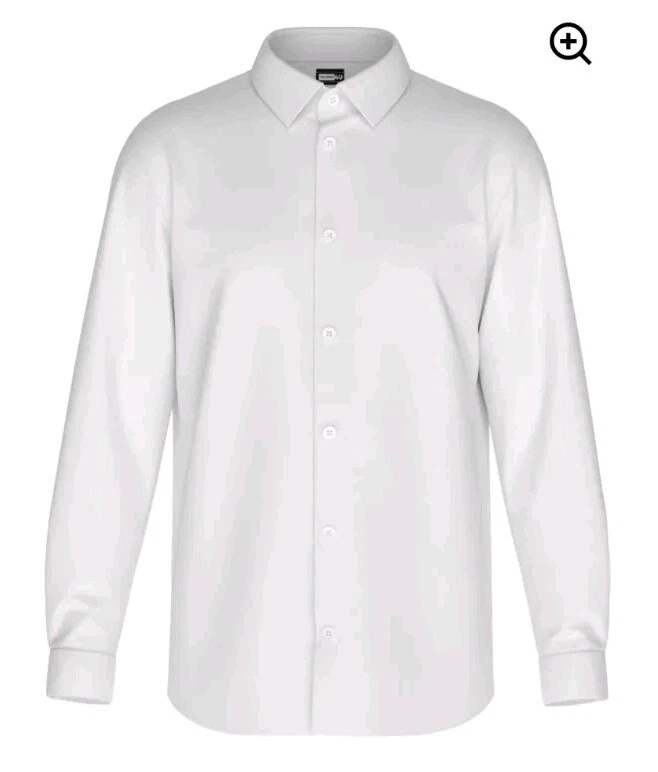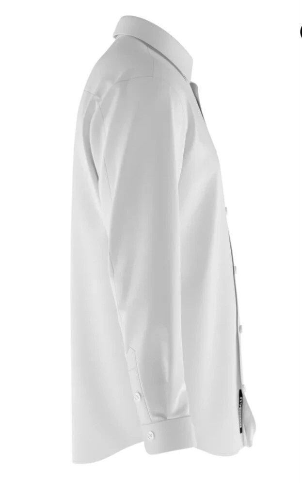 This tailored men's dress shirt in white features a solid pattern with a collared neckline and button closure. Made of 82% nylon and 18% spandex, it offers a comfortable 4-way stretch and breathable wear. The long sleeves with barrel cuffs and spread collar add a touch of formal appeal, suitable for various occasions such as travel, weddings, parties, and work. The shirt is machine washable and available in size M from the brand tailored 4U.