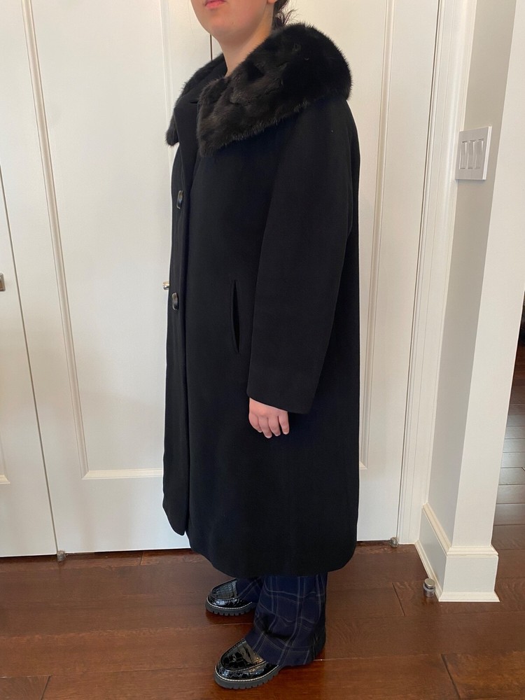 Elevate your wardrobe with the Tailored Woman black wool jacket, a timeless piece that effortlessly combines sophistication with classic style. Featuring a luxurious mink collar that adds a touch of elegance, this jacket is a must-have for the fashion-conscious woman. The long jacket/coat length provides ample coverage, making it an ideal choice for cooler weather.Crafted from high-quality wool, this jacket offers both warmth and comfort. The regular size M ensures a flattering fit for a variety of body types. Additional features include a collared design and distinctive lapel, enhancing the jacket's sleek silhouette. Whether dressed up for a night out or styled casually for daytime wear, this jacket is versatile for any occasion. Vintage from the 80s, great condition. Model is 5’ 4”
