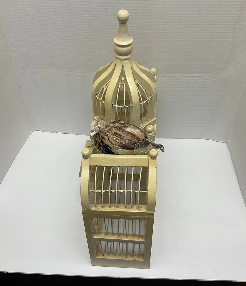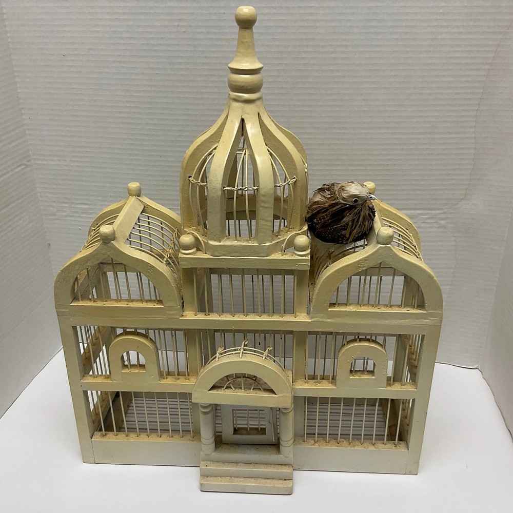 Taj Mahal Inspired Vintage White Wood and Wire Bird Cage and Decorative Bird. 100% of sale benefits charity. See photos for condition details. Size: 15.5L 20inchT 6.5W
