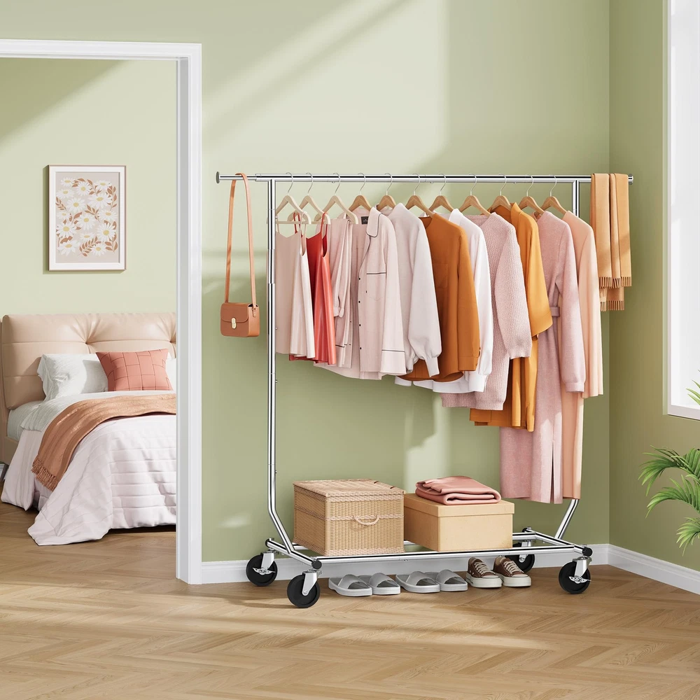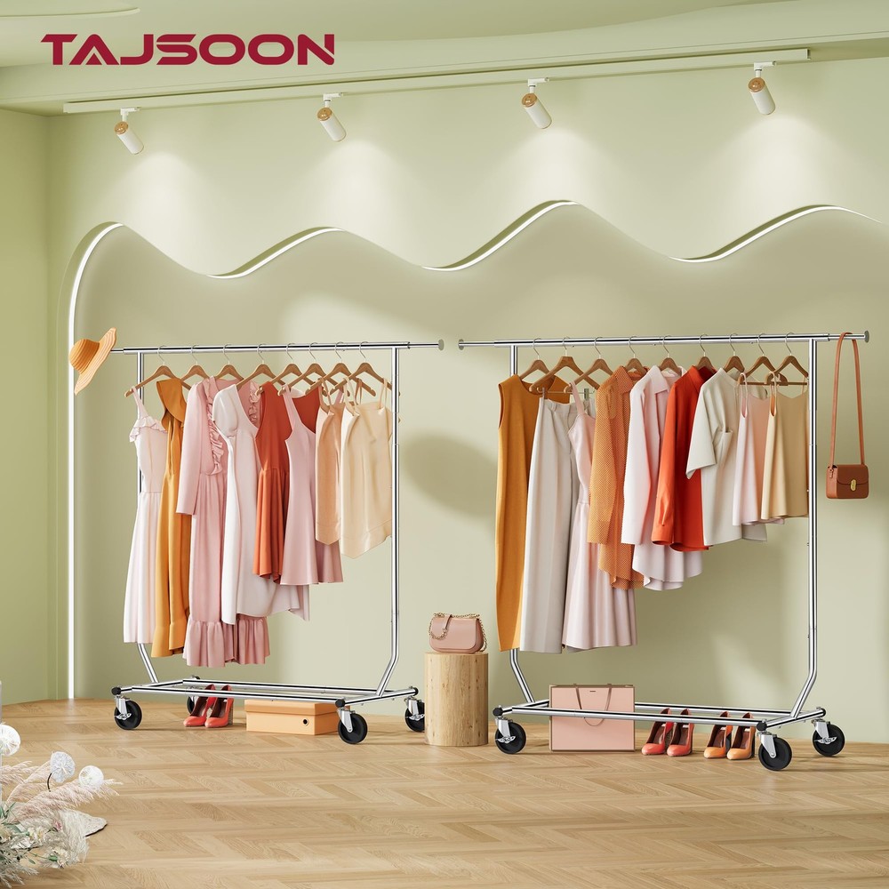 【Collapsible Clothing Rack】Tajsoon heavy duty clothes rack make the most of free space in any room. Collapsible design for folding the rolling garment rack flat to save space or easy its transport when not in use, suitable for bedrooms, living rooms, bathrooms, shopping malls, and balconies. 【Extendable & Adjustable Clothes Rack】Horizontal Rod of this heavy duty clothing rack can be extended from 50.8'' to 65.8'' and vertical height can be adjusted from 57'' to 62''. You can adjust the length and height of the foldable garment rack to meet your space needs. 【250Lbs Load Capacity】Made of high quality metal and thick pole, the collapsible clothes rack supports up to 250 lbs( 150lbs on the hanging rods and 100lbs on the bottom shelf). And the whole foldable clothing rack with durable chrome coating aims to enhance protection against water, rust, corrosion & scratch. 【360° Wheels with Brakes】 Four 360° swivel casters, 2 of which have brakes, make it easy for you to move this foldable clothes rack from room to room and lock it in place when needed. Besides, the rubber wheels are durable and will protect your floor from scratches. 【Multifunctional Clothing Rack】 Our clothes racks for hanging clothes is integrated by clothes rack and freestanding shelf, ideal for organizing & creating storage space in any room, great for guests who need a place to hang clothing or rack shoes,luggage,and for using as a spare clothing closet. Also, this rolling clothing rack can be a perfect choice for gift-giving or housewarming. 【Collapsible Clothing Rack】Tajsoon heavy duty clothes rack make the most of free space in any room. Collapsible design for folding the rolling garment rack flat to save space or easy its transport when not in use, suitable for bedrooms, living rooms, bathrooms, shopping malls, and balconies. 【Extendable & Adjustable Clothes Rack】Horizontal Rod of this heavy duty clothing rack can be extended from 50.8'' to 65.8'' and vertical height can be adjusted from 57'' to 62''. You can adjust the length and height of the foldable garment rack to meet your space needs. 【250Lbs Load Capacity】Made of high quality metal and thick pole, the collapsible clothes rack supports up to 250 lbs( 150lbs on the hanging rods and 100lbs on the bottom shelf). And the whole foldable clothing rack with durable chrome coating aims to enhance protection against water, rust, corrosion & scratch. 【360° Wheels with Brakes】 Four 360° swivel casters, 2 of which have brakes, make it easy for you to move this foldable clothes rack from room to room and lock it in place when needed. Besides, the rubber wheels are durable and will protect your floor from scratches. 【Multifunctional Clothing Rack】 Our clothes racks for hanging clothes is integrated by clothes rack and freestanding shelf, ideal for organizing & creating storage space in any room, great for guests who need a place to hang clothing or rack shoes,luggage,and for using as a spare clothing closet. Also, this rolling clothing rack can be a perfect choice for gift-giving or housewarming.
