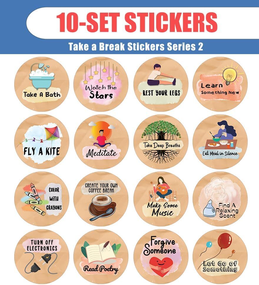 16 UNIQUE DESIGNS INSPIRING STICKERS FOR YOUR DIY PERSONALIZED DECORATIONS - Creanoso Take a Break Series 2 Stickers (10-Sheets). These colorful and uniquely inspiring round shaped stickers are the best tool for DIY decoration and personalization of your belongings. GREAT STOCKING STUFFERS , TEACHING SUPPLEMENTARY MATERIALS, AND GIVEAWAY - Great stocking stuffers gifts for Boys, Girls, Teens, Kids. A perfect design to give during classroom school activities, home schooling,birthdays, anniversaries, family day, and any other special occasions. MADE WITH DURABLE AND WATERPROOF MATERIALS - There is a lamination or coating to make the stickers high water resistant, and WILL NOT fade from the water. The stickers can stick it anywhere you like, and it sticks there and lasts a long time. A COLORFUL AND DECOR STICKER DECAL - Each sheet with 16 individual round stickers. There are 10 sheets , with a total of 160 pcs of stickers. STICKER SIZE: 1.5 INCHES IN DIAMETER Take a Break Stickers Series 2 (10 Sets X 16 Designs) COLORFUL AND COLLECTION OF TEXT STICKERS • Well designed. • Very encouraging. • Self-adhesive. Take a Break Stickers Series 2 (10 Sets X 16 Designs) are super fun to collect; you can't have just one! That's why you will find a selection of stickers right here. Each package comes with different stickers in a variety of designs. Stick them here, stick them there, stick them everywhere! Everyone will love these self-adhesive stickers. These colorful stickers are perfect for any adults and these come with very inspiring messages and bright pictures. A fun, inexpensive way to add a decorative, notes, and stationery. Delight yourself with uplifting messages designs that are very encouraging. Take a Break Stickers Series 2 (10 Sets X 16 Designs) perfect for giveaways, behavior incentives, prizes! These stickers are acid-free, nontoxic, and safe for use on photos. This product comes with a 60 days money back guarantee. You can return them to us for a full refund.