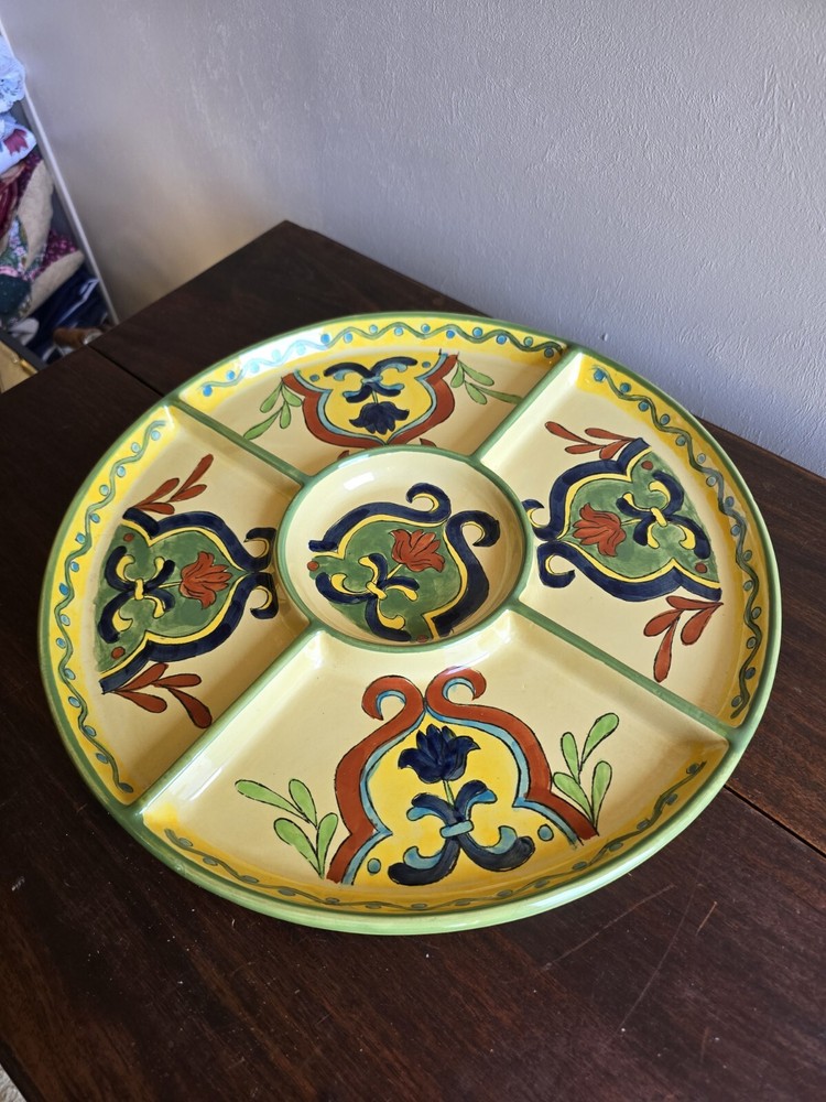 Theme:ArtType:dipSize:LargeStyle:mexicanWood Tone:noneItem Diameter:15 inMaterial:CeramicOccasion:All OccasionsFinish:GlossyPattern:All-OverBrand:TalaveraCountry/Region of Manufacture:ChinaShape:RoundNumber of Compartments:5Color:MulticolorPersonalize:NoFeatures:Easy to FillNumber of Items in Set:1