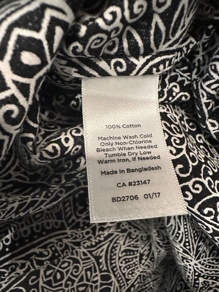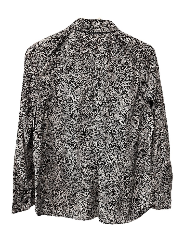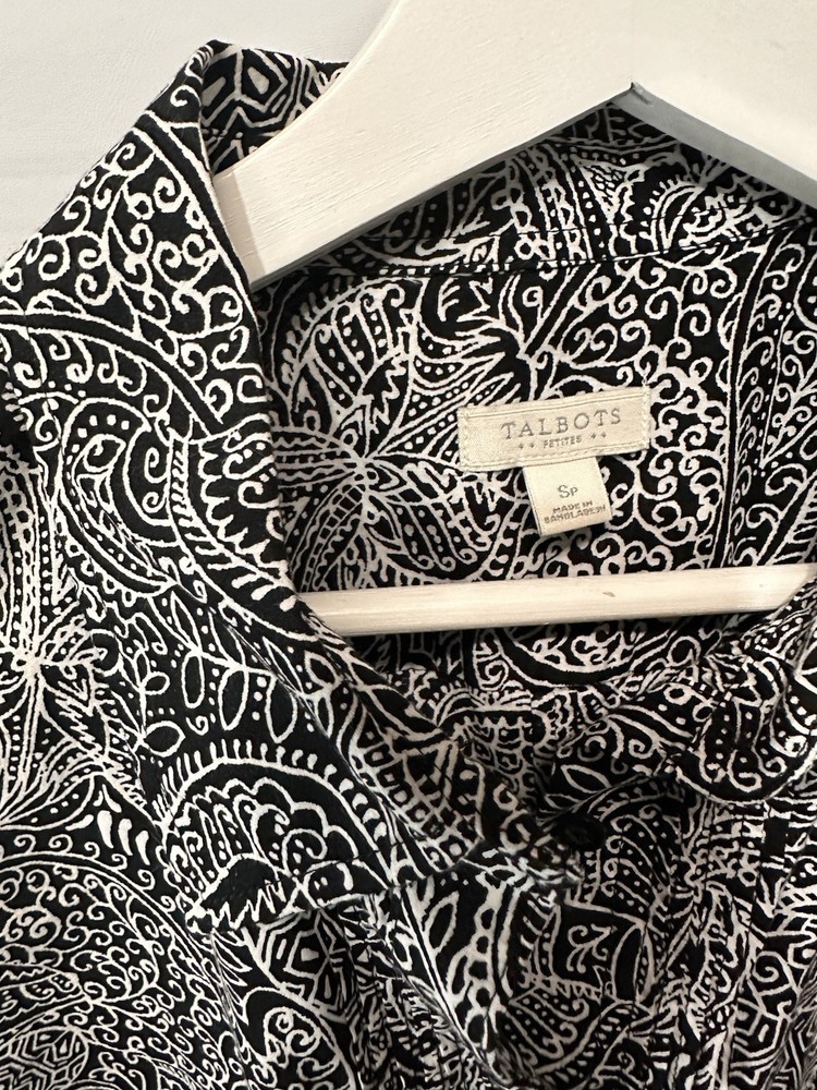 This Talbots black and white paisley blouse is a stylish and versatile top for women. Made from 100% cotton with a woven fabric type, it features a collared neckline and button front closure. With long sleeves and a regular fit, it is suitable for casual and business occasions, making it a great addition to any wardrobe. The breathable and lightweight design of this blouse makes it perfect for all seasons, providing comfort and style for the winter, summer, fall, and spring.
