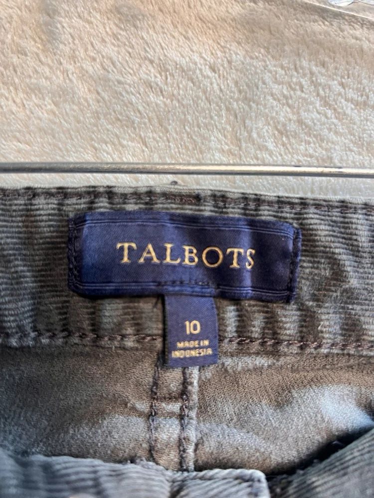 Fabric Type: Corduroy Size: 10 Color: Gray Country/Region of Manufacture: Indonesia Features: Pockets, Stretch Style: Chino Department: Women Theme: Bohemian, City, Hipster, Preppy, Retro Front Type: Flat Front Garment Care: Machine Washable Season: Fall, Spring, Winter Leg Style: Straight Inseam: 31.5 in Occasion: Casual Type: Pants Personalize: No Closure: Button, Zip Fit: Regular Pattern: Solid Handmade: No Size Type: Regular Material: Cotton, Cotton Blend, Spandex Brand: Talbots Vintage: No MPN: 245 Waist Size: 32 in