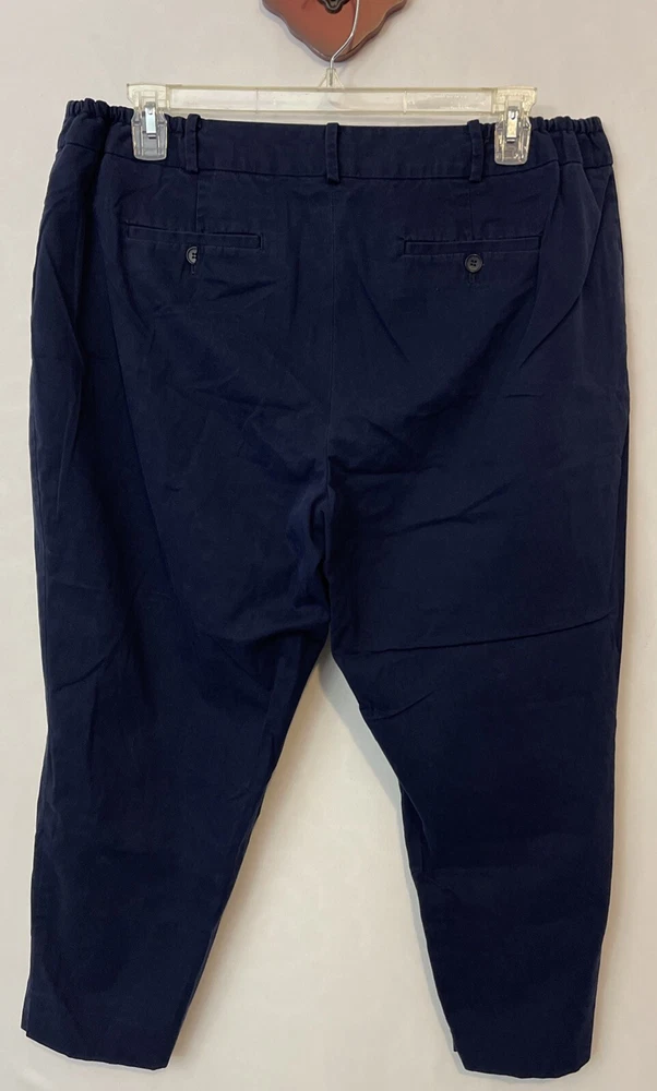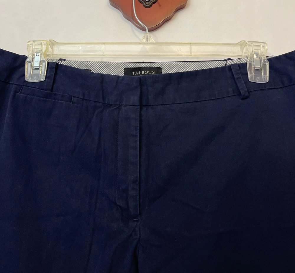 Elevate your casual wardrobe with these stylish Talbots Heritage capri pants. The blue pants feature a solid pattern, zip, button, and hook & eye closure, and belt loops for added detail. The flat front and straight leg style provide a classic and timeless look, while the spandex and cotton material blend ensures comfort and stretch for all-day wear. These plus-size pants are perfect for any casual occasion, and the elastic and adjustable waist provide a flattering fit. The pants also feature pockets and are made with breathable fabric, making them a practical addition to any wardrobe. Add these classic capri pants to your collection today! One back button needs replaced. Inseam: 25 inches. Waistband: 20 inches across laying flat.