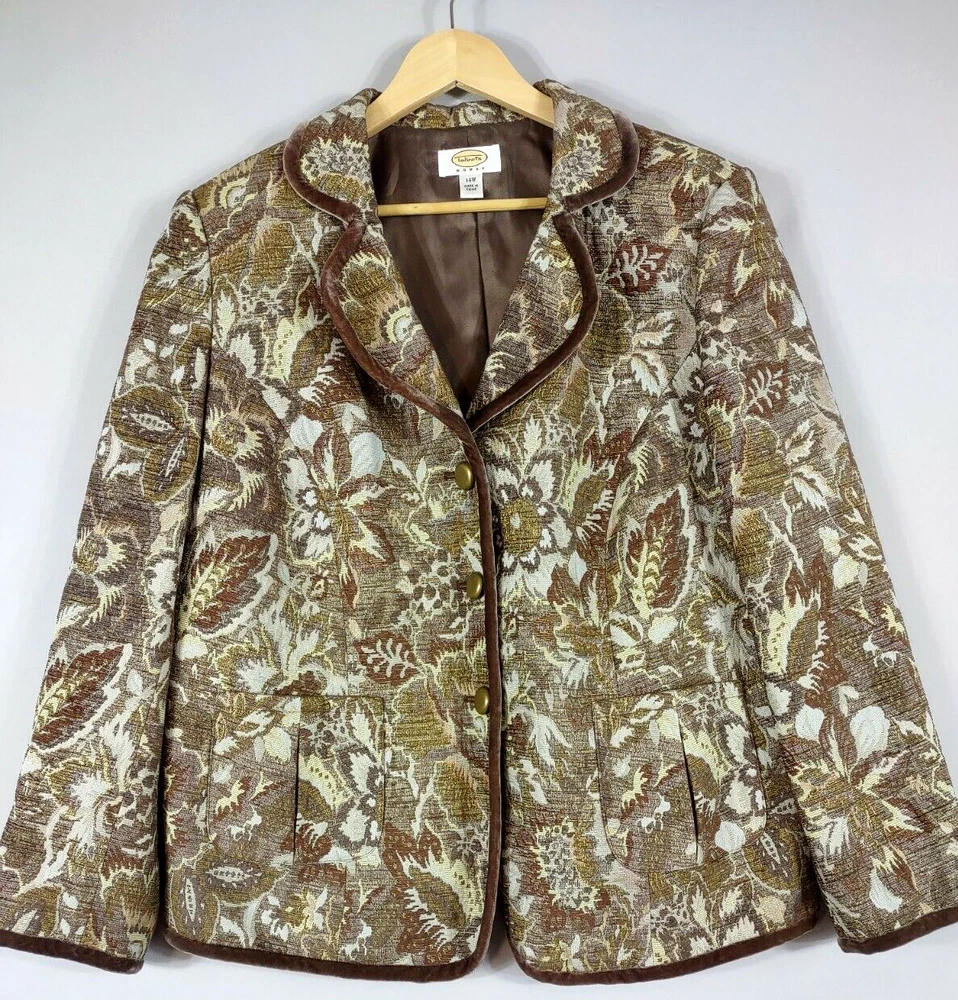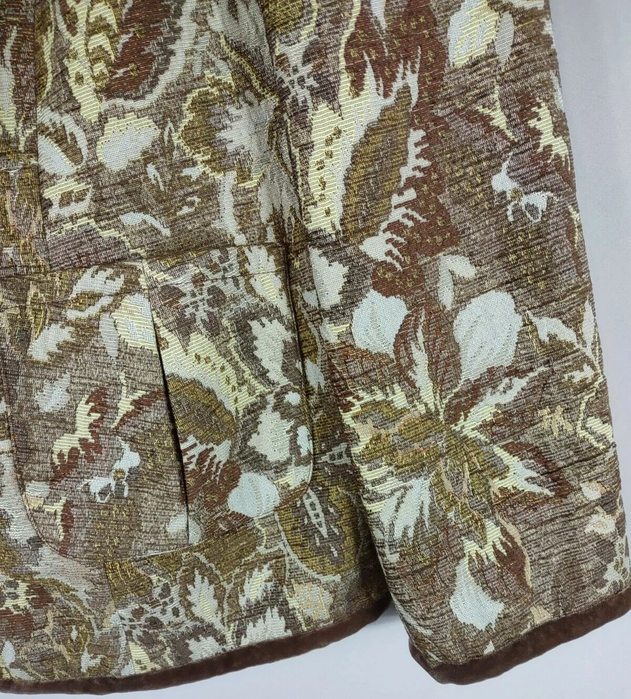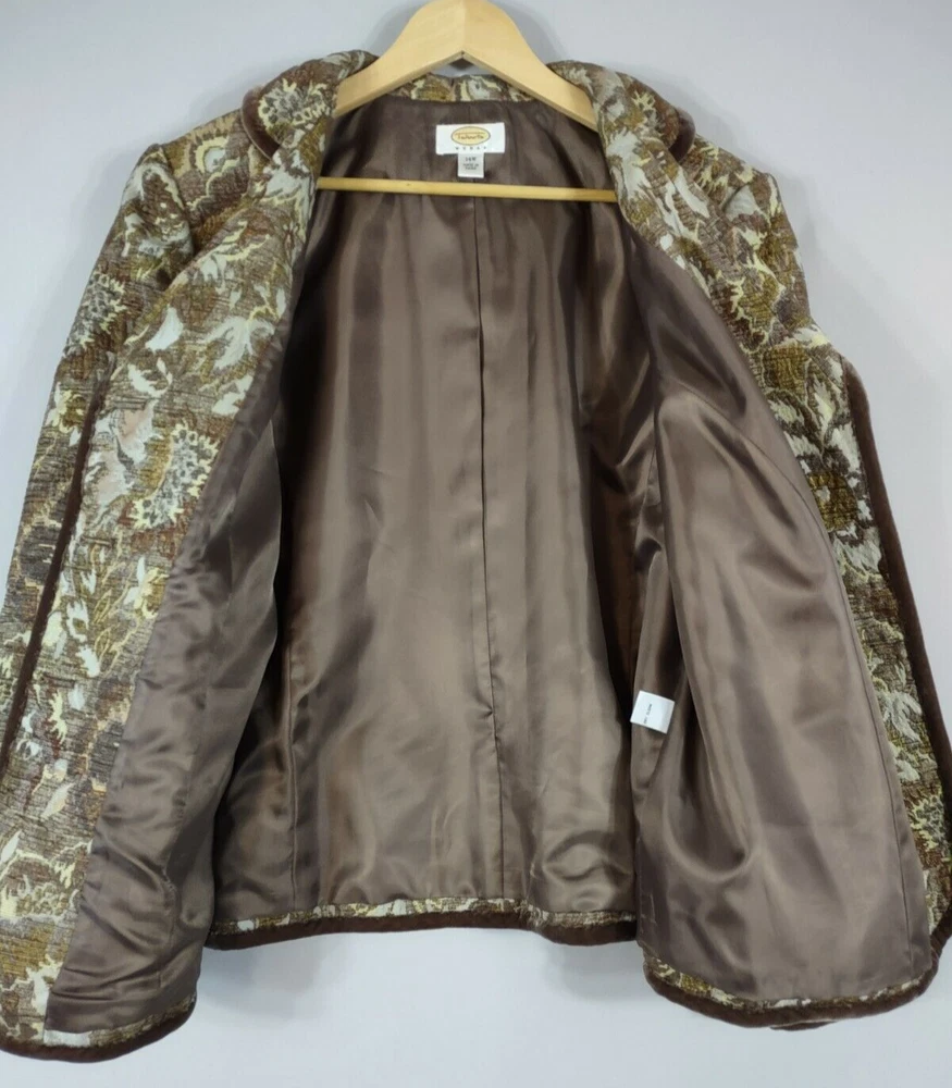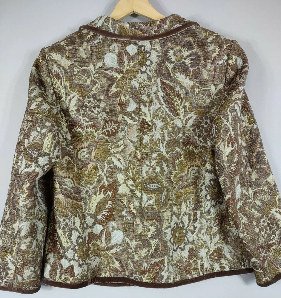 Talbots Jacket Women 14 Brown Jaquard Tapestry Velvet Trim Lined Short Button Up