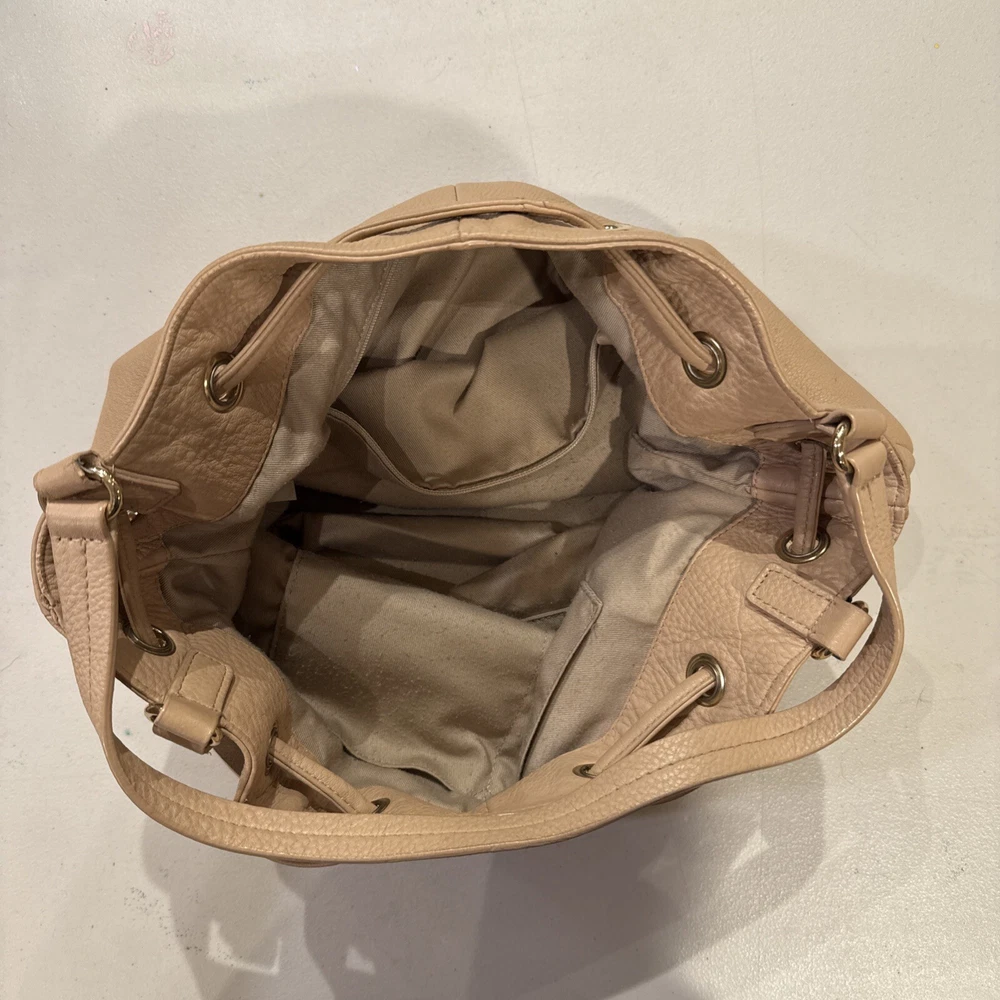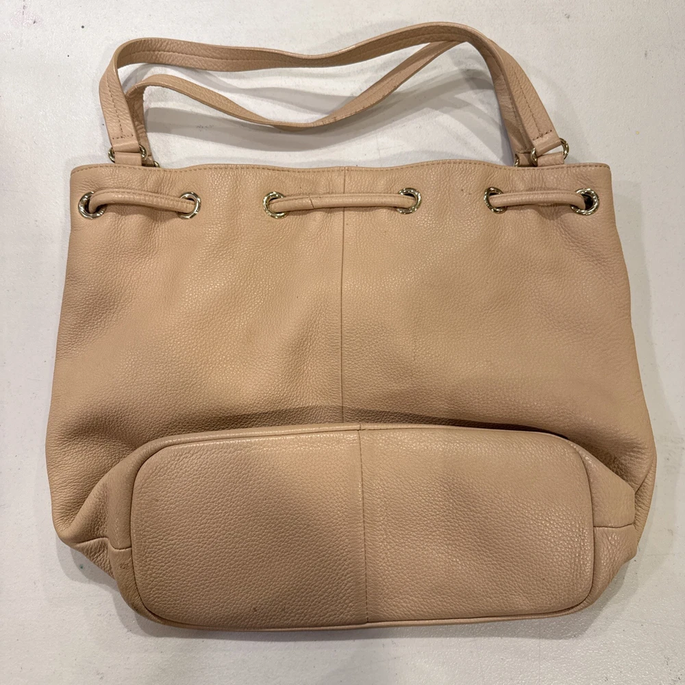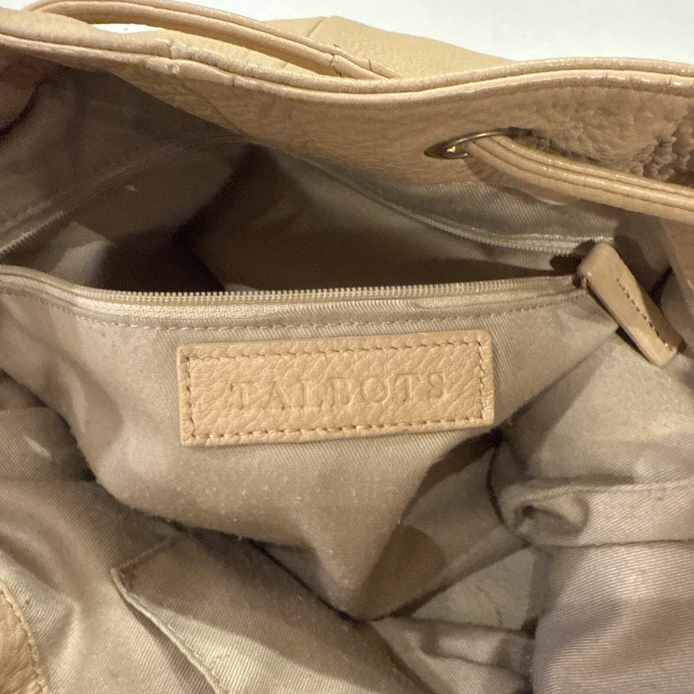 Lining Material: Fabric Size: Large Department: Women Handle/Strap Color: Beige Hardware Color: Gold Brand: Talbots Exterior Color: Beige Exterior Material: Leather Bag Height: 11 in Handle/Strap Material: Leather Lining Color: Beige Closure: Drawstring Bag Width: 15 in Style: Tote