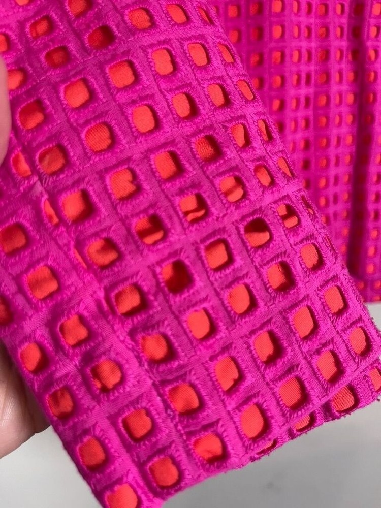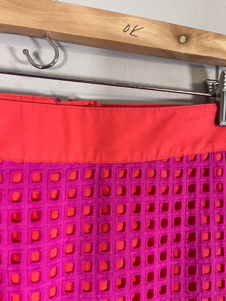 This skirt is a fantastic find! The retro 80s style with fun cutouts makes it a unique piece for the office or casual wear. The high-waist fit is flattering, and the stretchy cotton fabric is super comfortable. It arrived in great pre-owned condition—no flaws at all! Shipping was lightning-fast, and the seller provided clear measurements. Perfect for work, church, or even a summer concert. Love the bold pink color—such a statement piece! Highly recommend!