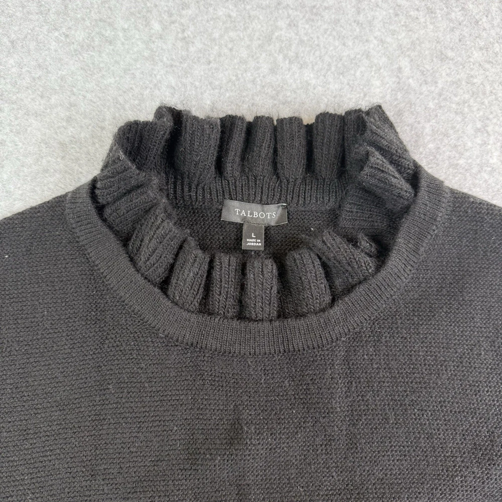 Talbots Women’s Black Ruffle Neck Knit Sweater Size Large Cotton Wool Blend. In excellent pre-worn condition. Made out of nylon, acrylic, and polyester. See exact measurements. Bust 20” Length 26” SKU E15