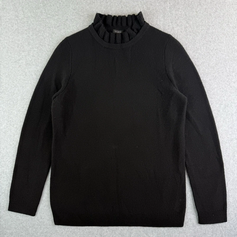 Type: Sweater Fit: Regular Character: Belle Sleeve Length: Long Sleeve Material: Wool Blend, Cotton, Cotton Blend Theme: Classic, Preppy, Cottagecore, Neutral, Coastal Grandma, Feminine, Black Romantic, Romantic Accents: Ruffle Fabric Type: Knit Department: Women Garment Care: Machine Washable Brand: Talbots Color: Black Features: Stretch Size: L Season: Winter, Fall, Spring Sleeve Type: Regular Sleeve Knit Style: Open-Knit Pattern: Solid Occasion: Casual, Workwear, Party/Cocktail Size Type: Regular Neckline: Mock Neck Style: Pullover