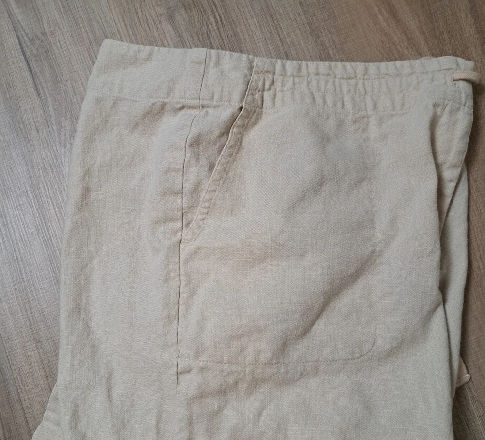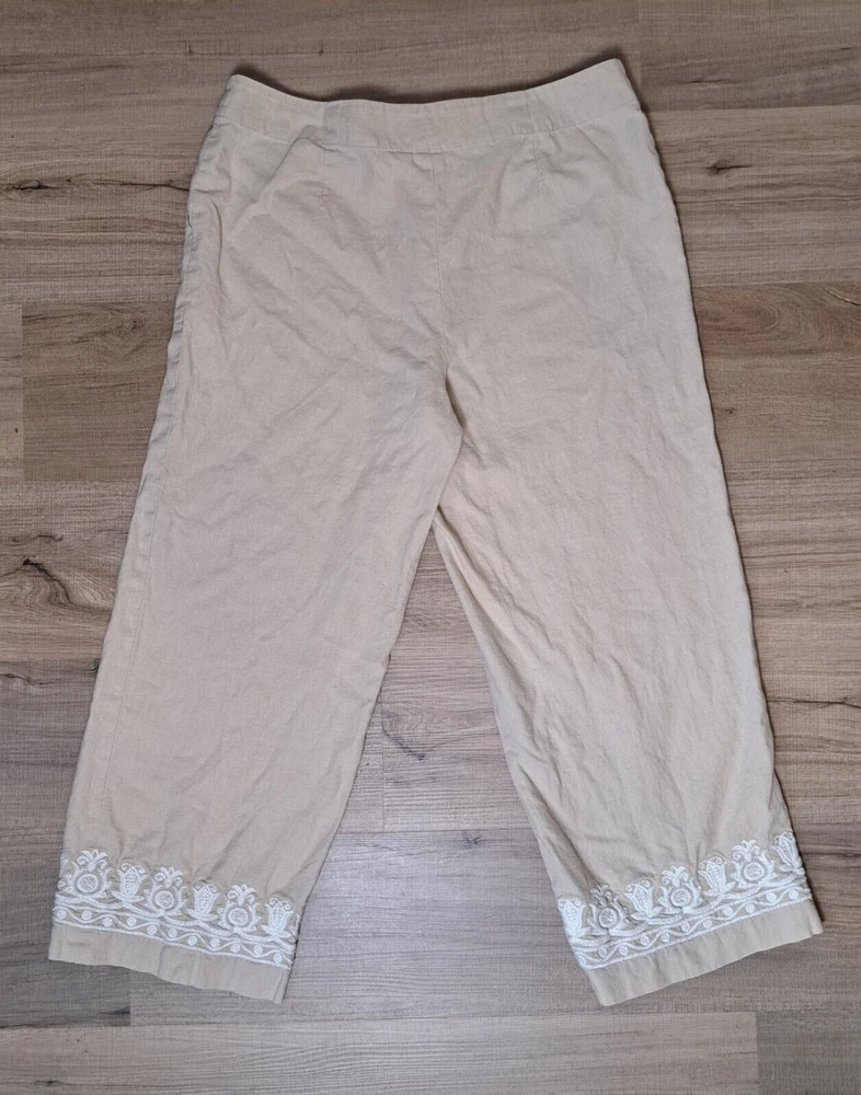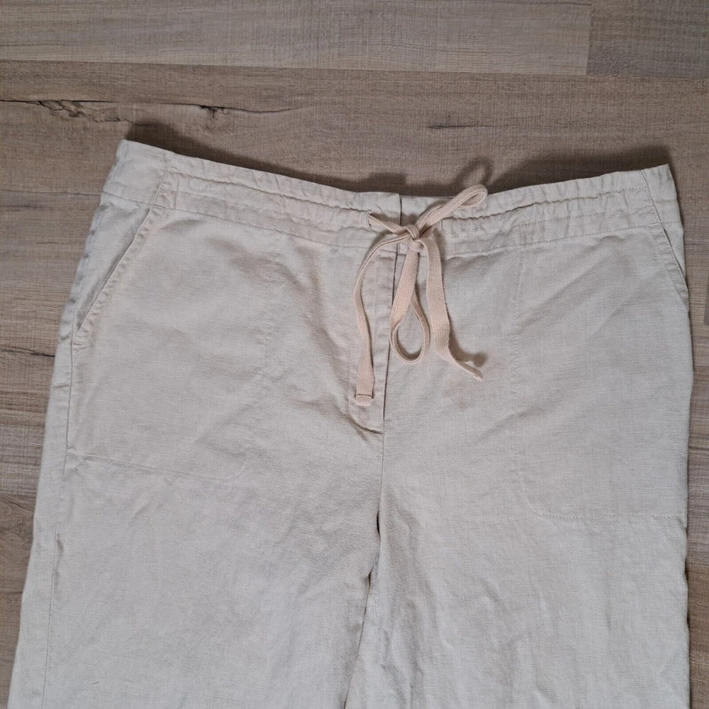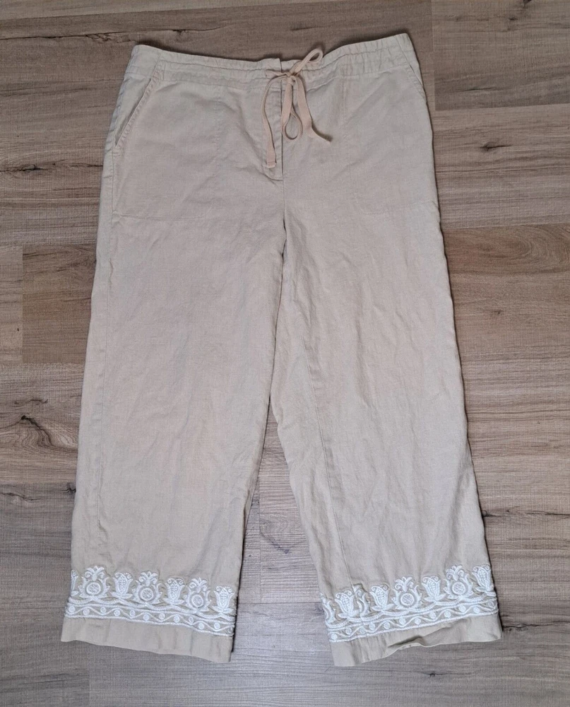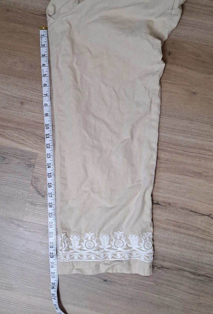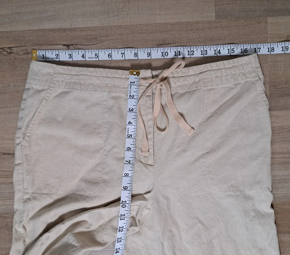 Used in Great condition, please see pictures for details and measurements. Elevate your summer wardrobe with these Talbots women's linen blend cropped pants in a beautiful beige color. These pants feature a straight leg and are embroidered with subtle accents, making them perfect for any occasion, whether it's a party, casual outing, or travel. The pants have a comfortable fit with a mid-rise and a drawstring closure that adds a touch of versatility to the garment. Crafted from a linen-cotton blend, these pants are breathable and machine washable, making them easy to care for. The pockets on the front and flat front style add functionality and a classic touch. These pants are perfect for the summer, fall, and spring seasons and are a must-have for any fashion-forward woman's wardrobe.