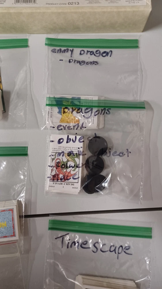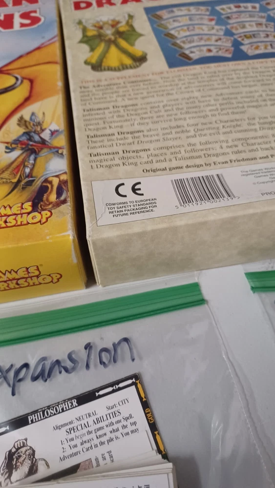 This talisman lot includes mainly just the cards. There are no boards, sheets, or rules for any of the games. Most of them do not have the character cards. All cards were checked against inventory lists. Below is what is included: Main game - No character cards, board, rules, and missing 3 counters. It does all spell, adventure, purchase, and misc cards. also includes all counters, but 3. Timescape expansion - no board, data sheets, or rule book. Includes character, spell, and timescape cards. Adventure expansion - no character, rules, or character sheets. Includes all spell, adventure, and alternative ending cards. City expansion - no character cards, board, stands, or rules. Includes all special character, spell, adventure, dungeon, city adventure, and purchase cards. Dragons expansion - no character or rules cards. Includes box, adventure cards, stands, and dragon king card. Box has minor wear. Dungeon expansion - no character cards, board, rules, or q&a. Includes all adventure and dungeon cards. Talisman expansion - missing all but two character cards. Includes all spell, adventure cards, and philosopher and pilgrim cards.